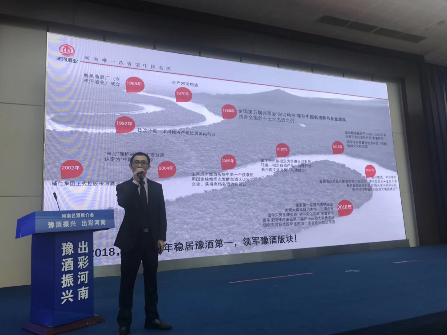 河南省宋河酒业股份有限公司品牌部经理乔仲凯介绍了宋河酒的“五十荣耀”、“豫酒品质标杆”、“国字宋河‘窖香幽雅’、‘醇香怡人’、‘绵甜爽净’、‘余味悠长’、‘香味谐调’、‘典型完美’酒体特点”、北斗七艺的酿酒技艺,介绍了宋河酒业致力公益事业的情怀、中国礼遇的博大精深。