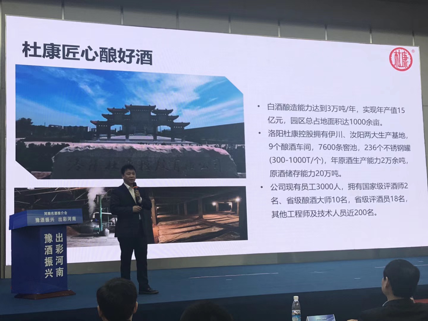 洛阳杜康控股销售公司总经理柳向阳说,杜康,是华夏酿酒鼻祖,是中华美酒之源,是中国历史文化名酒,是中国酒文化的起源地;杜康,是人名,是地名,是酒名,是酒文化;杜康,属于洛阳,属于河南,属于中国,属于全球华人。柳向阳介绍了杜康酒的起源、杜康河的“五大怪”(‘两脚一跺泉出来’、‘鸳鸯虾,抱一块,鸭生双黄蛋,人生龙凤胎’、‘柳树的肚子抱了个乖’等)、豫酒转型发展以来取得的巨大变化、振兴发展三大因素等,让杜康焕发活力,再造辉煌。
