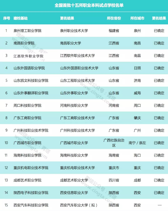日前,教育部正式批准了首批本科职业教育试点高校更名结果,它们由“职业学院”正式更名为“职业大学”,同时升格为本科院校。从分布来看,14所职业大学来自全国10个省份,河南有1所。