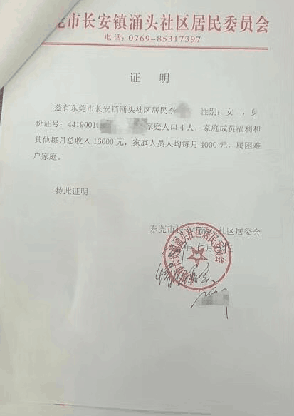 一份网传文件称,广东省东莞市长安镇一户居民家庭均月收入1.6万元、人均收入四千元,被评为困难户家庭。对此,东莞长安镇人民政府相关工作人员回应:涌头社区居民李某身患重大疾病。据李某及其家属反映,其在治疗期间已花费近100万元医疗费用,后续每月仍需医疗费用约7万元。因此,李某及其家属向社区提出医疗救助申请。