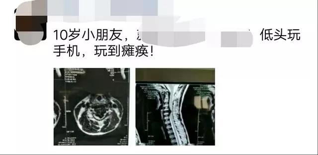 最近一位骨科医生发的朋友圈分享了一则触目惊心的病例,他在动态中写到:10岁小朋友,低头玩手机玩到瘫痪。点开图片一看,一张磁共振上颈椎管内出现明显的突出。三分之二以上的椎管被突出的椎间盘占据,脊髓被严重压迫变形。只因孩子迷上了吃鸡游戏,一玩就是几小时。