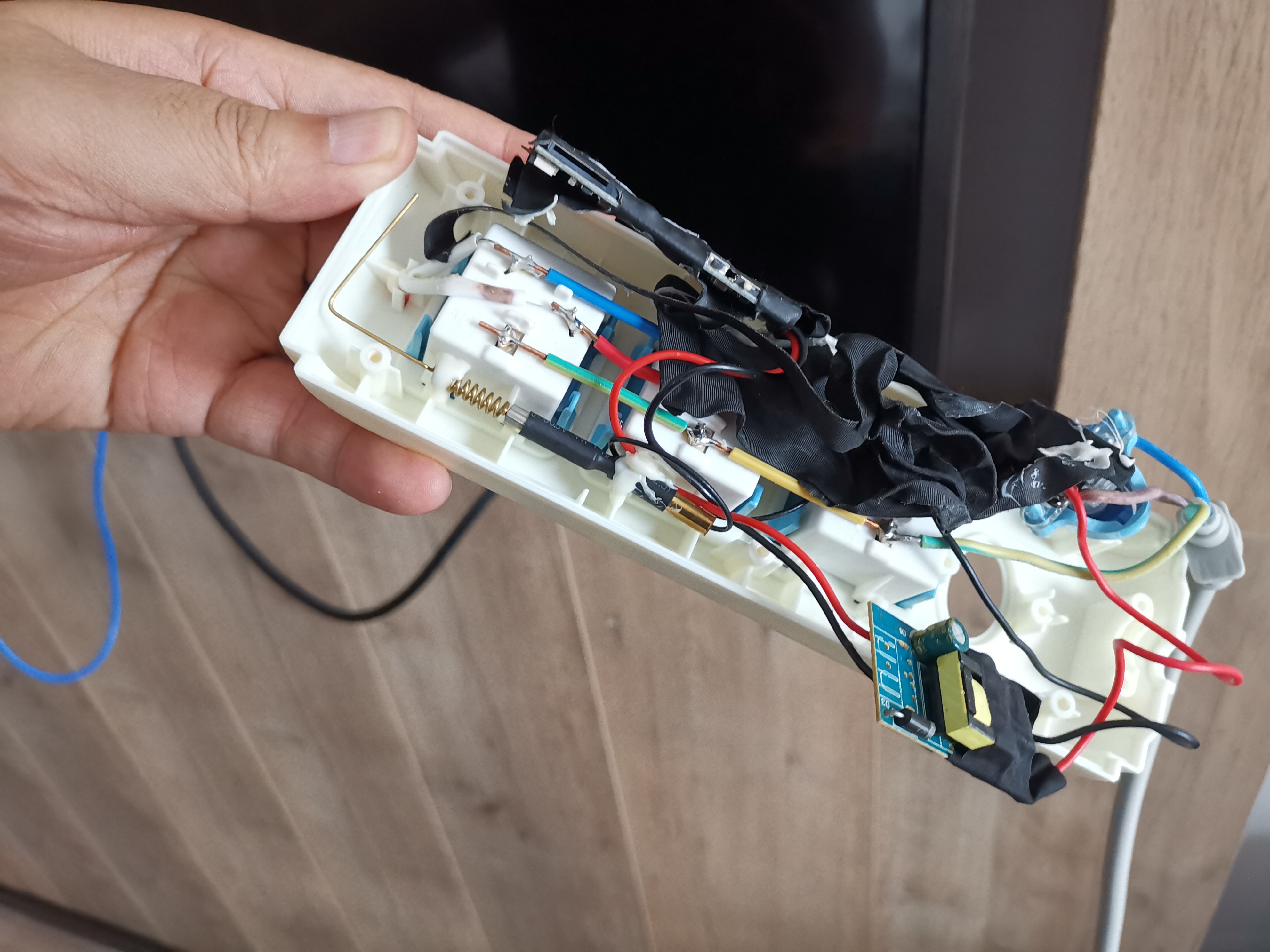 7月3日下午4时,大河报·大河客户端记者赶到该酒店,看到白色插板的位置在电视机正下方,一侧有一个针孔,正对着床的位置,拆开后里边有多条电线,显然是经过改装过的插板。