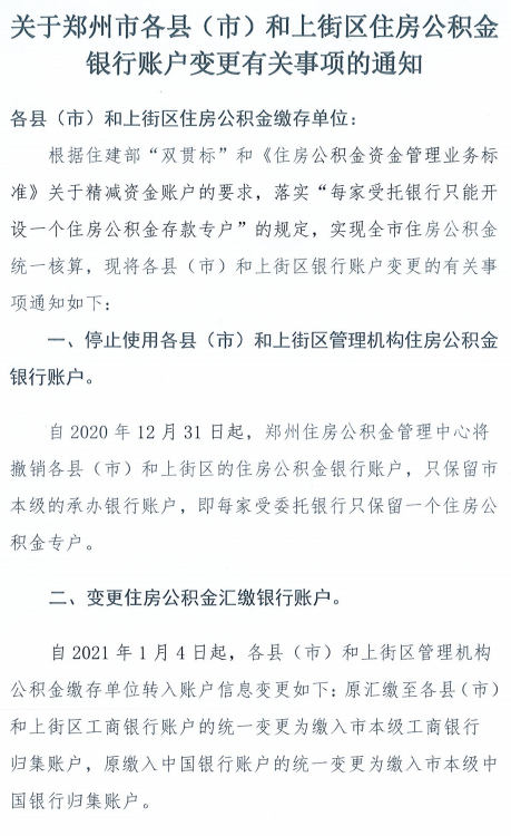 自 2020 年12月31日起,郑州住房公积金管理中心将撤销各县(市)和上街区的住房公积金银行账户,只保留市本级的承办银行账户,即每家受委托银行只保留一个住房公积金专户。