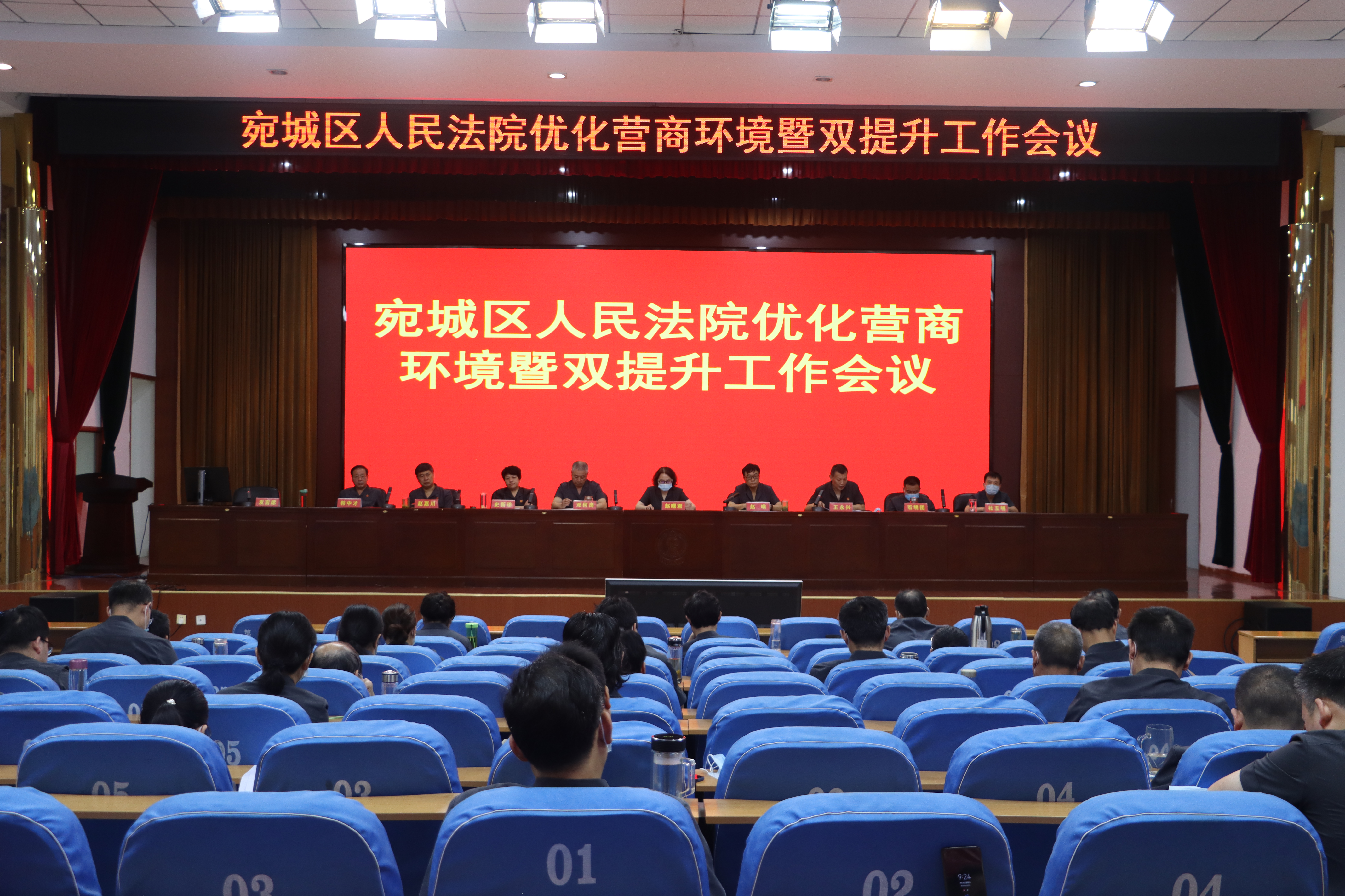 9月4日上午,南阳市宛城区人民法院召开优化营商环境暨双提升工作会议。该院党组书记、代院长赵曙君出席会议并讲话。院党组副书记、副院长赵喻主持会议,院领导、各部门负责人、人民法庭庭长及员额法官参加会议。