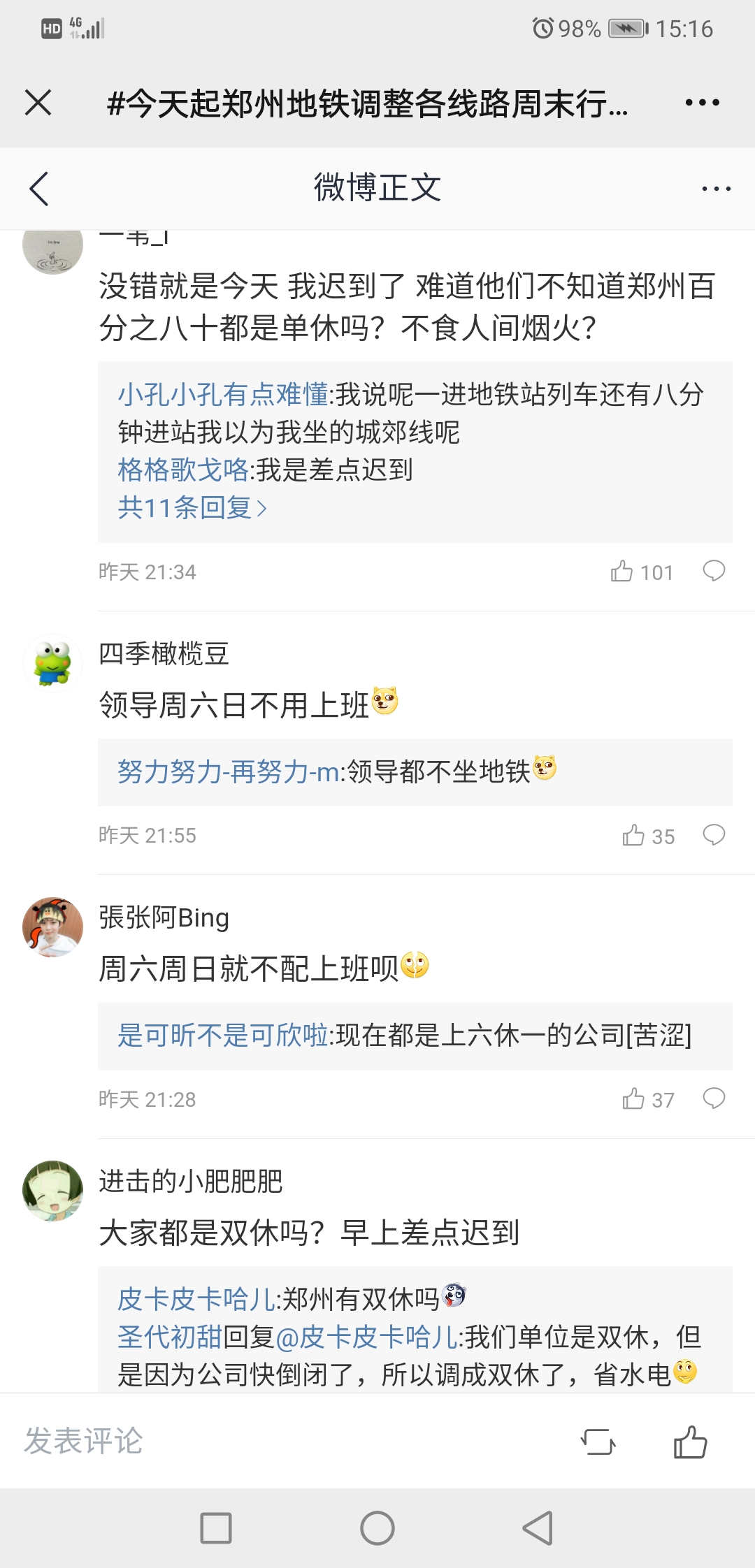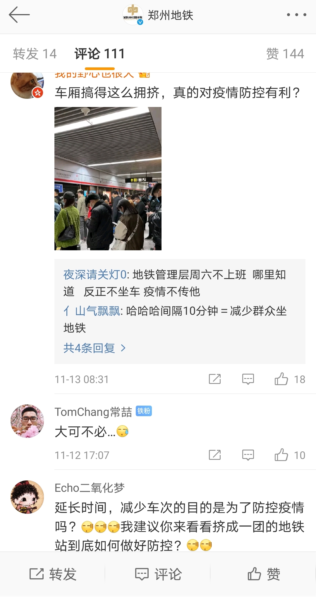 大河报记者在郑州地铁官方微博的评论区看到,不少网友在该通告的评论区留言说,并非每个人周末都不上班,不少公司是“单休”制,周六要上班,郑州地铁调整周末行车间隔的首个周末,就导致不少周末单休的上班族迟到。