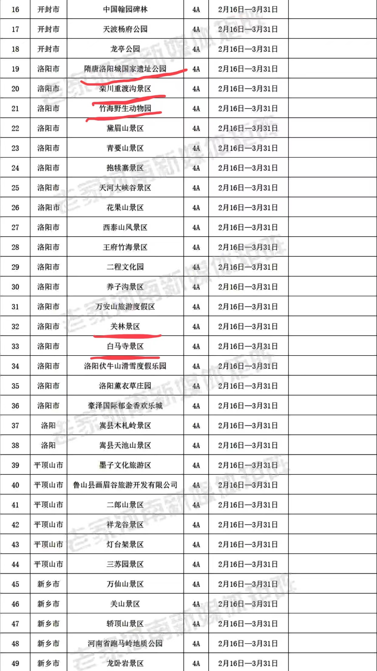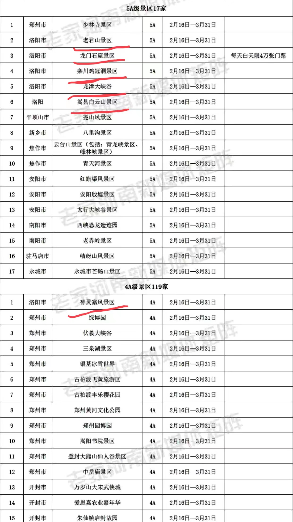 据悉,洛阳共有38家A级景区对游客免门票。包括5A级景区5个、4A级景区22个、3A级景区11个。老君山、龙门石窟、白云山、白马寺等知名景区出现在名单中。