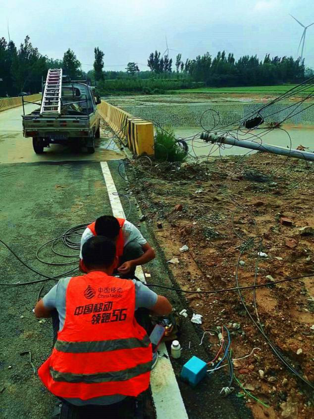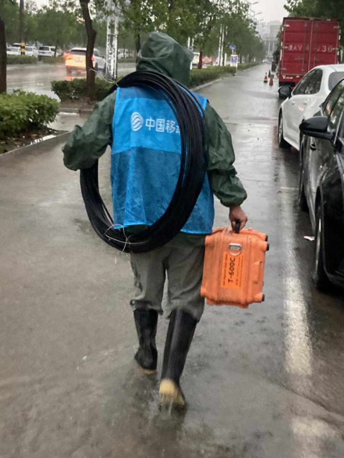 河南移动郑州分公司做足防汛应急准备,同时以雨为令组织各分公司展开防汛抢险工作。7月5日下午16时,新密大部分地区突降暴雨,部分道路严重积水、交通中断无法通行。郑州新密分公司联合铁塔、铁通、代维等组建应急抢险突击队,多专业统一指挥,协同作战,携带应急装备,快速前往抢修地段及停电站点进行作业。山陡路滑,车辆无法正常前往,他们就推车前进,道路不通,他们就手提肩抗,快速赶到抢修现场抢险保通。