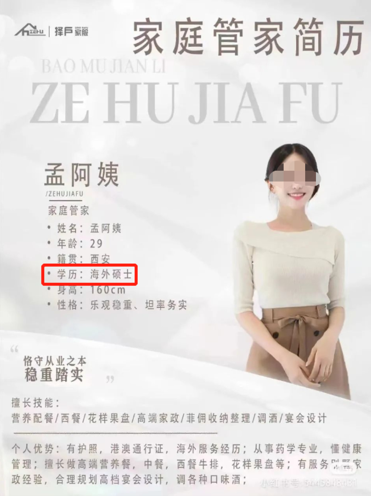 近日,陕西西安一家家政公司在小红书上发布引流广告,图片中多位“阿姨”打扮靓丽,时尚又年轻,并且都是高学历,有的是海归硕士,有的是985本科。该广告引发网友猜想。