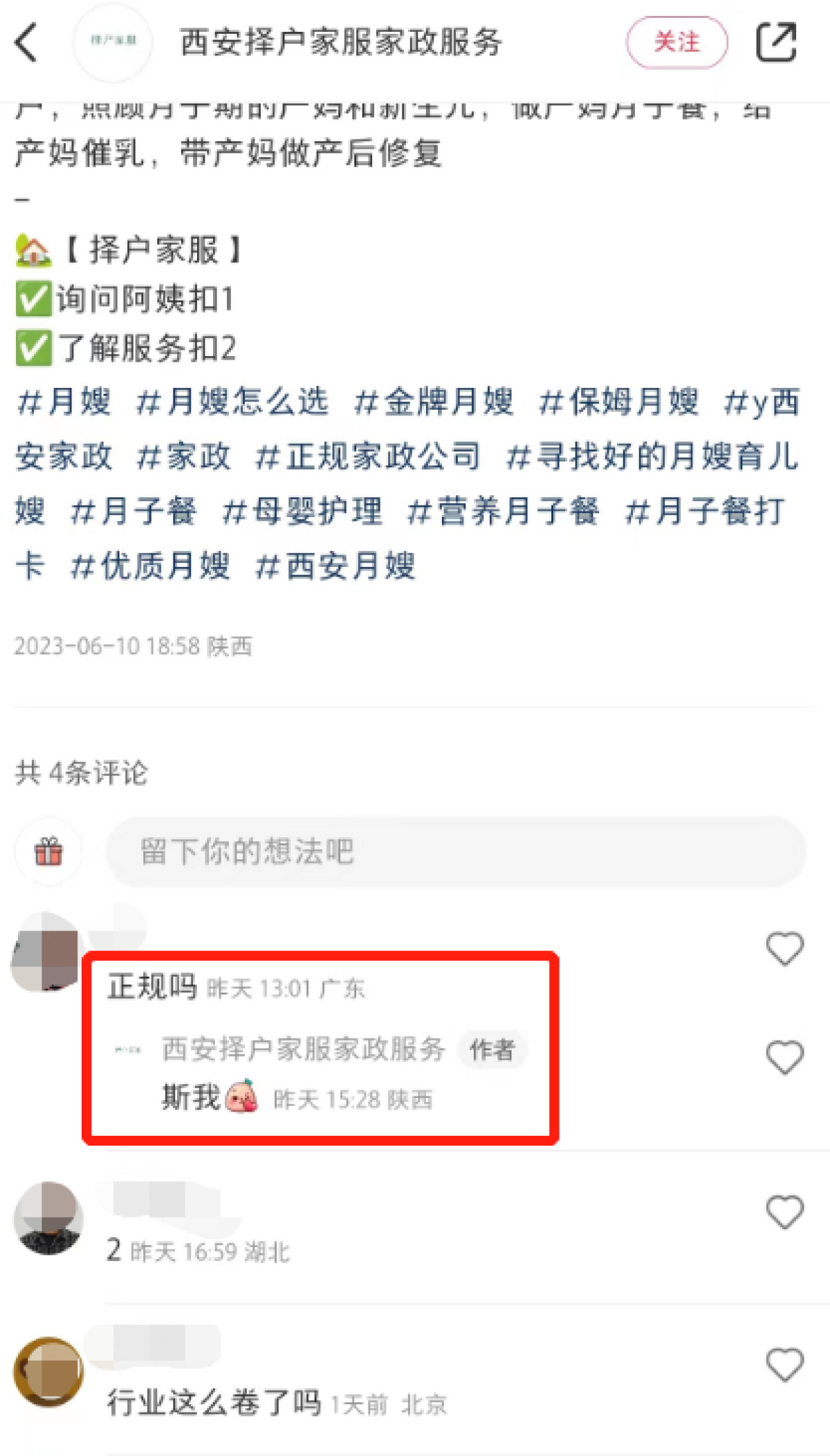 6月15日,对于此事,博主“嘁嘁子”认为,这个家政公司是盗图打擦边球做虚假广告引流,运营人员三观不正。