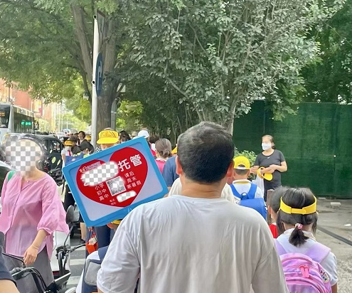 下午4点45分左右,西城区南二环内的一所小学门口,三年级的学生陆续排队走出校门。路口处,小杨将托管班的牌子高高举起,在人群中四处张望着。
