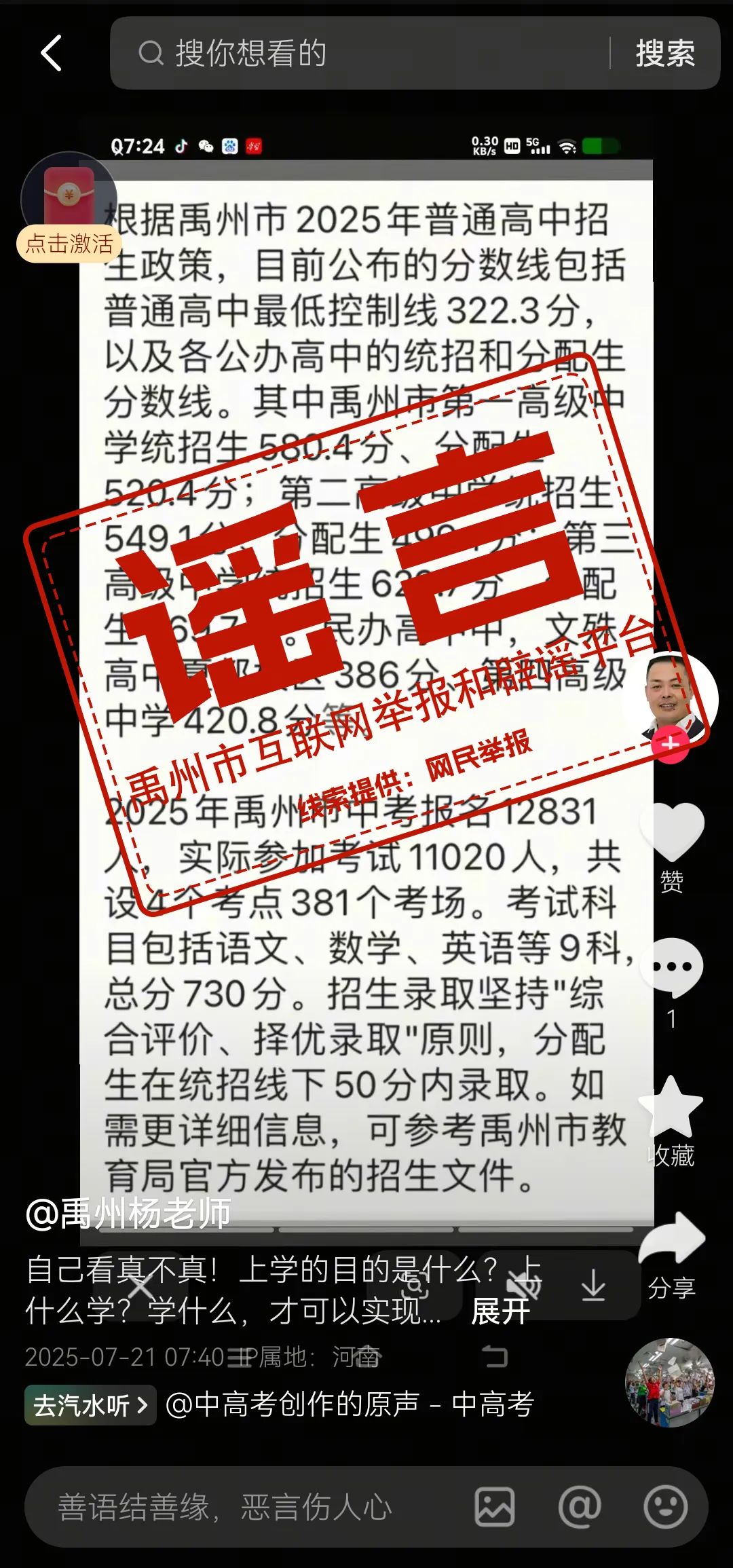 7月 21 日 7时40分 ,某平台账号 “ 禹州杨老师 ”发布 “禹州市高中统招生和分配生分数线”相关信息,经向禹州市教体局核实, 2025年 相关分数 线 信息尚未公布,发布者 利用 2024年相关分数线信息散布虚假谣言 。 目前,相关不实信息已经删除。