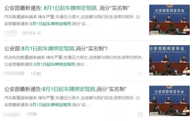 近日,许多公众号都在发布一则消息,说公安部发布最新通告:8月1日起,车牌绑定驾照,消分(注:应为'销')“实名制”,理由给的也很充分,这样做是为了杜绝黄牛党,治理这种销分乱象,除了不能找黄牛党以外,也不能用家人的驾照代扣分了。