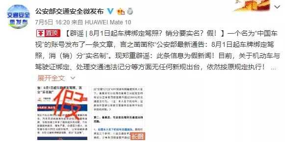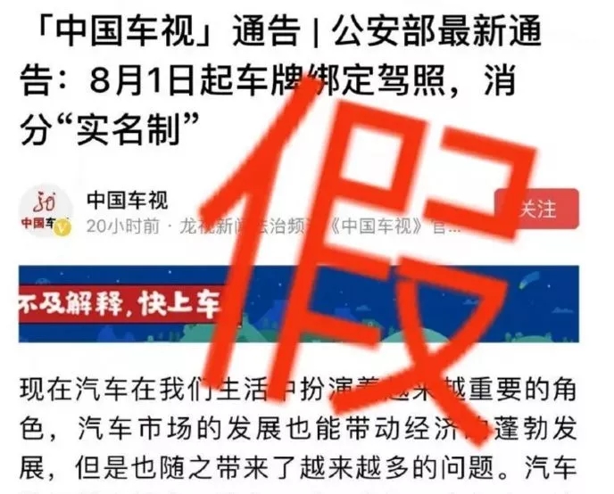 今日头条平台上一个名为“中国车视”的账号也发布了一条文章,言之凿凿称“公安部最新通告:8月1日起车牌绑定驾照,消分(注:应为'销')‘实名制’。”