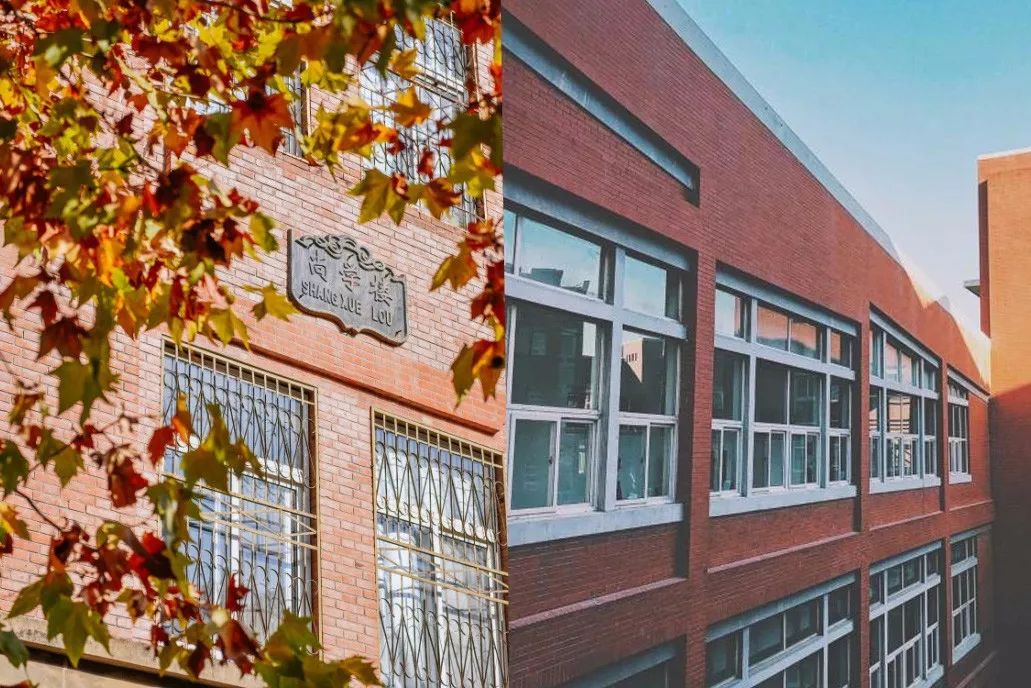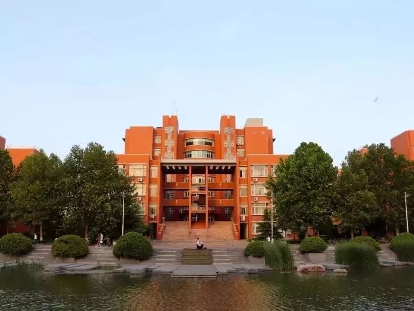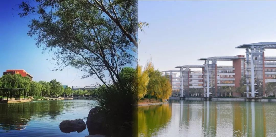 清澈的湖水、葱郁的岸边柳、庄严的教学楼