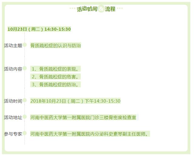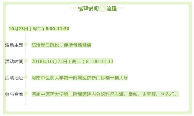 现为了纪念“国际骨质疏松日”,提高广大患友对骨质疏松症的认识、提高大众健康水平从而预防和减少骨质疏松性骨折的发生,河南中医药大学第一附属医院内分泌科将于2018年10月23日上午进行“关爱父母健康,关注骨质疏松”的大型义诊活动。