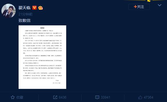 14日14:20左右,翟天临在微博发布致歉信,申请退出北大博士后相关工作 。