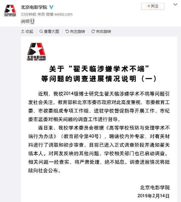 14日中午,北京电影学院回应“翟天临涉嫌学术不端”调查进展↓