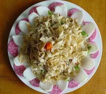 鹤壁人招待外地客商,除了淇河鲫鱼、缠丝鸭蛋外,浚县豆腐皮和二锅花生也是必上的菜品。别看都是凉菜,但在厨师的妙手调制下,依旧色香味俱全,是理想的下酒菜。特别是浚县豆腐皮,用温水略微发开,控去水分,整齐的刀工,配以芫荽、葱白、精盐、陈醋,淋上小磨香油或者芝麻酱,无辣不欢的还可以根据个人口味加点辣椒酱,放在桌上简直就是五彩斑斓。这个“浚县豆腐皮”就是大名鼎鼎的“王桥豆腐”的衍生品,至今已经有了三百多年的历史。可谓是鹤壁的“老字号”。