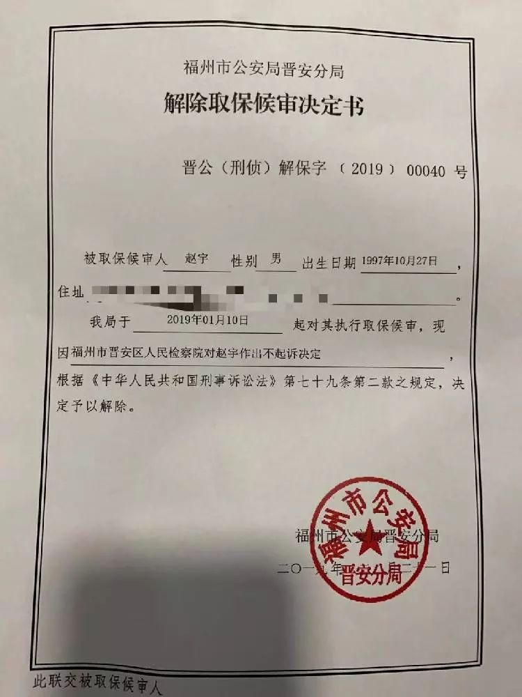 22日凌晨,福州市公安局晋安分局向赵宇送达了《解除取保候审决定书》及《退还保证金决定书》,意味着赵宇完全恢复人身自由。但对于后续是否承担民事赔偿,依然令赵宇感到担忧。详情