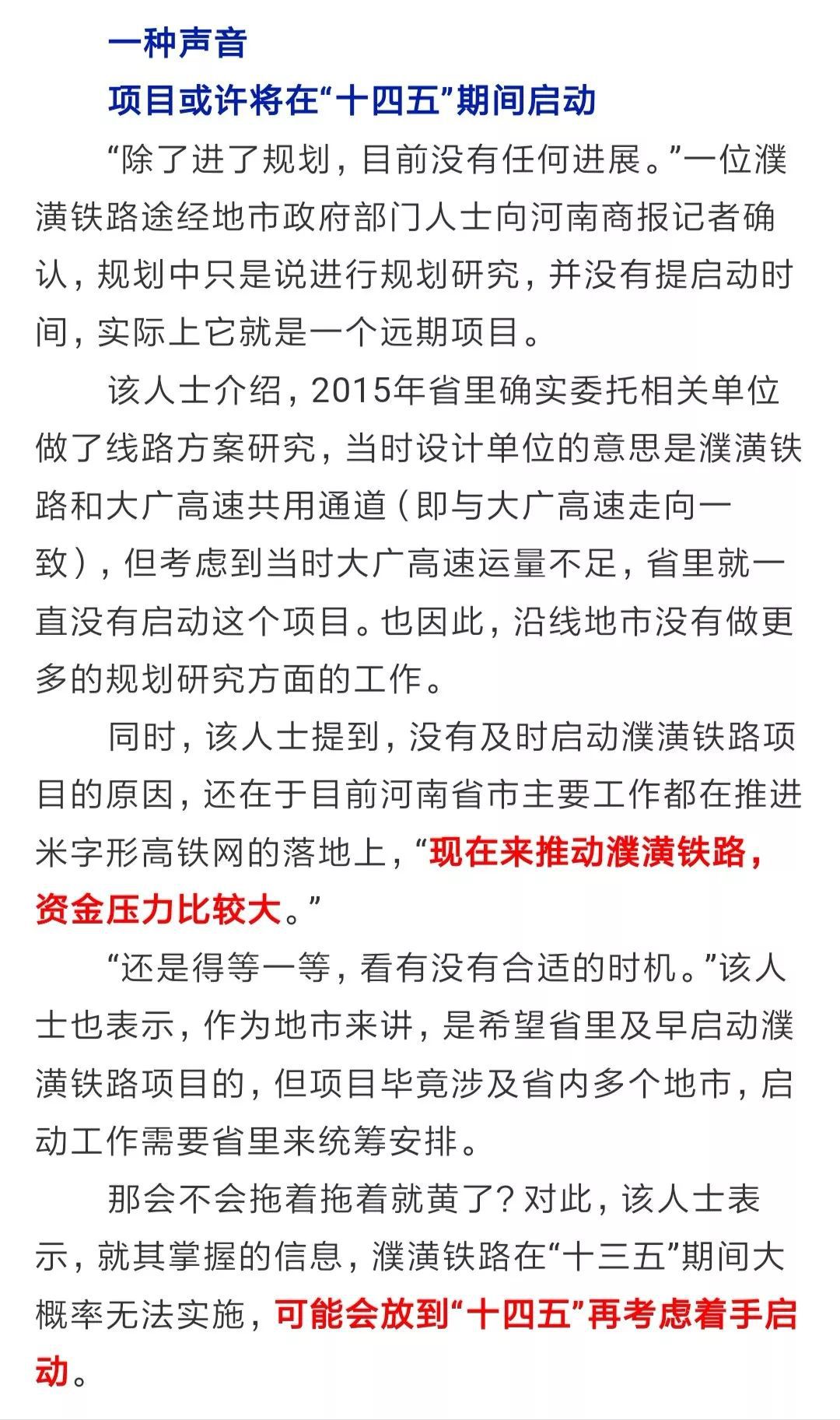 在2017年初发布的《河南省“十三五”现代综合交通运输体系发展规划》(简称“规划”)中,河南确实将濮潢铁路列入了规划研究范围。规划提到,要依托京九铁路、京九高铁、濮阳至潢川铁路等,形成连接南北的运输通道,省内串联濮阳、商丘、周口、信阳,加强豫东省际区域经济交流与产业协作。