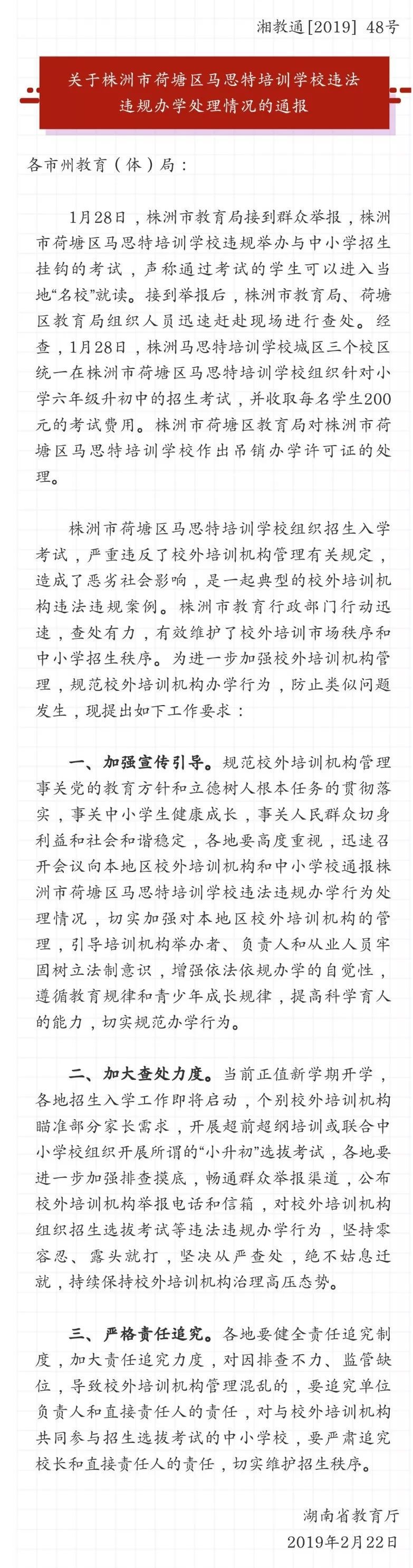 近日,湖南省教育厅对株洲市荷塘区马思特培训学校违法违规办学处理情况予以通报,并对进一步加强校外培训机构管理,规范校外培训机构办学行为,提出工作要求。