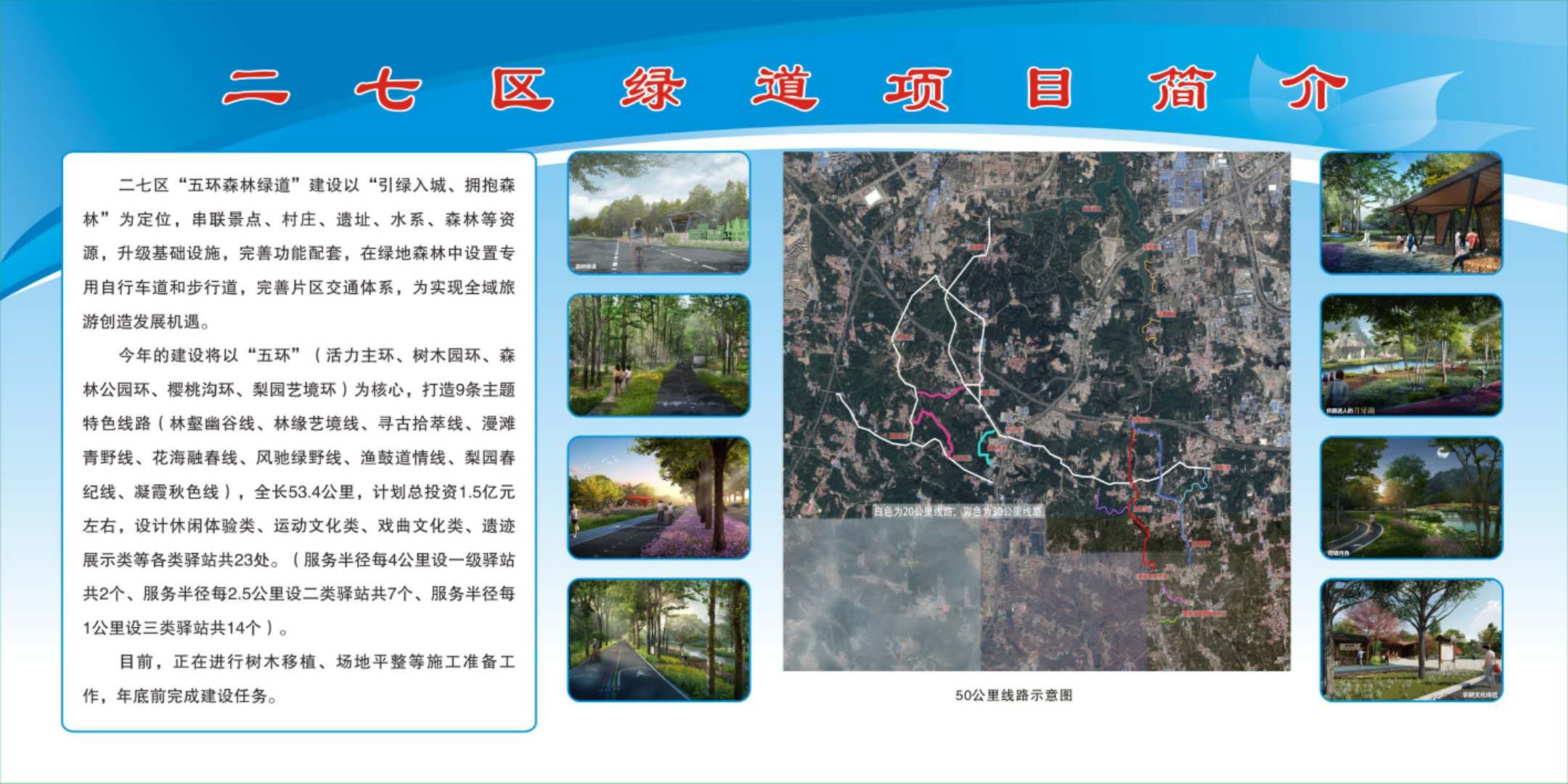 2019年的建设,将以活力主环,树木园环,森林公园环,樱桃沟环,梨园艺境环为核心,打造9条主题特色线路,即林壑幽谷线,林缘艺境线,寻古拾萃线,漫滩青野线,花海融春线,风驰绿野线,渔鼓道情线,梨园春纪线,凝霞秋色线,全长53.4公里,计划总投资1.5亿元左右,设计休闲体验类,运动文化类,戏曲文化类,遗迹展示类等各类驿站共23处。服务半径每4公里设一级驿站共2个,服务半径每2.5公里设二类驿站共7个,服务半径每1公里设三类驿站共14个。