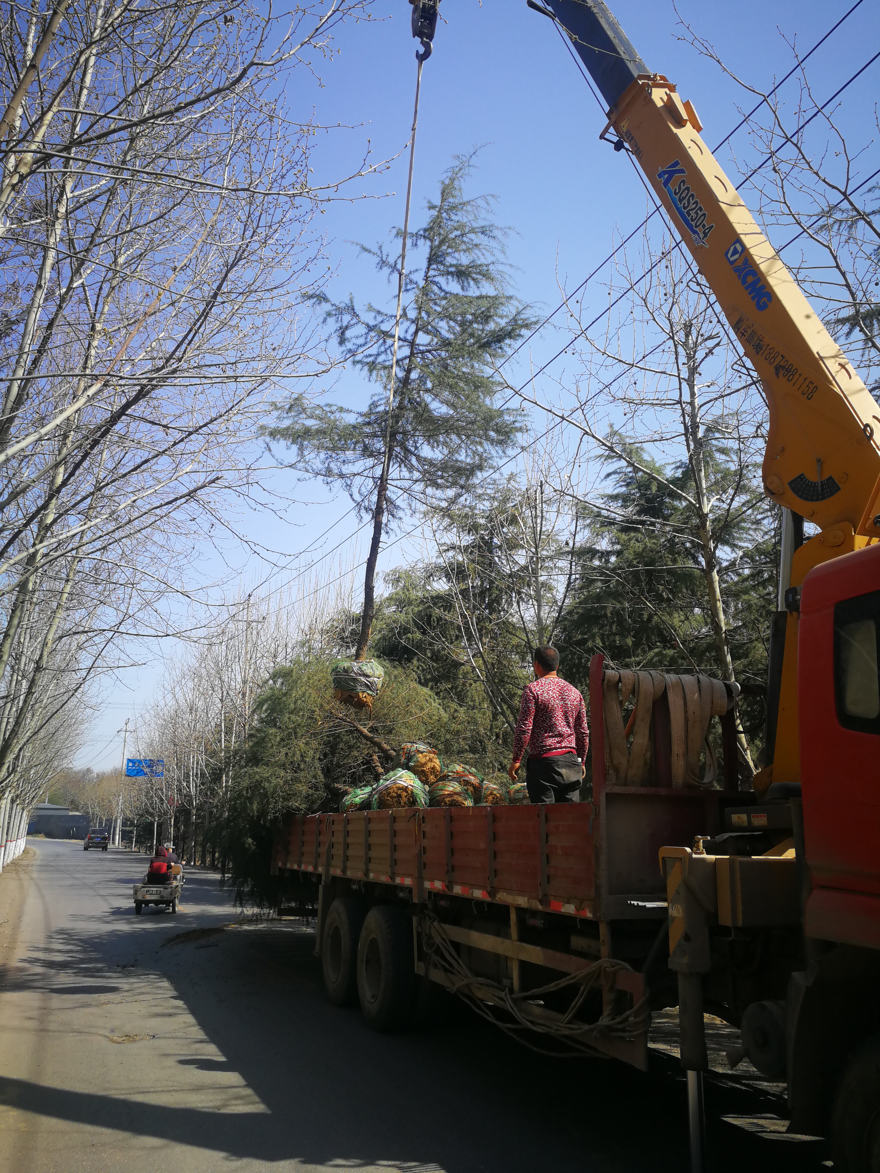 当天上午,记者在二七区杨西线及多条乡道,只见数十名工作人员,正将雪松、柏树移出“家园”。路旁,一辆吊车守候待命,等待着树木装车。