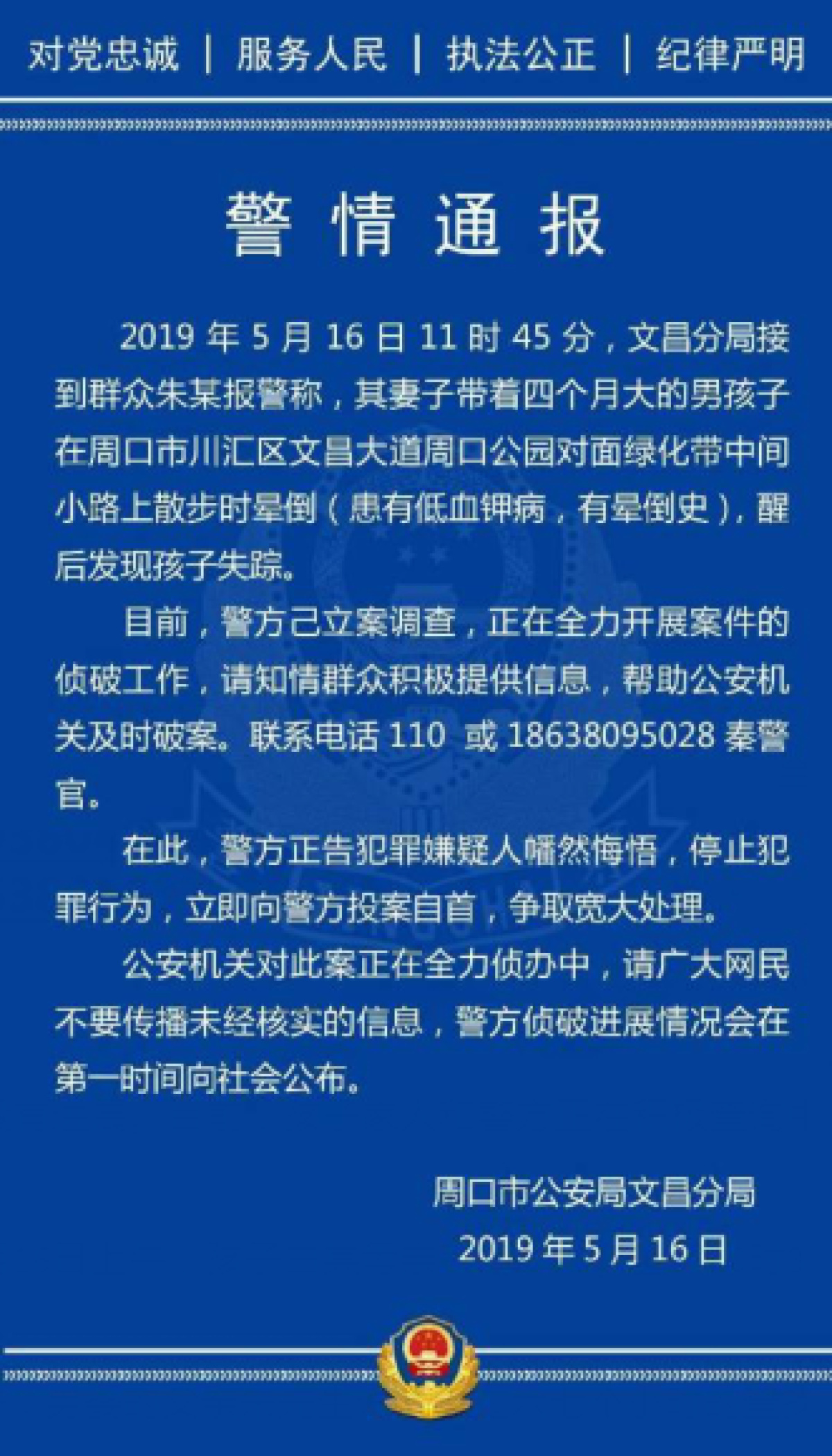 截至5月16日下午6时许,刷爆周口市民朋友圈的男婴丢失一事仍然没有进展。目前,孩子家人和警方正在积极查询中。同时,周口市公安局文昌分局发布通告,敦促犯罪嫌疑人幡然醒悟,中止违法行为。