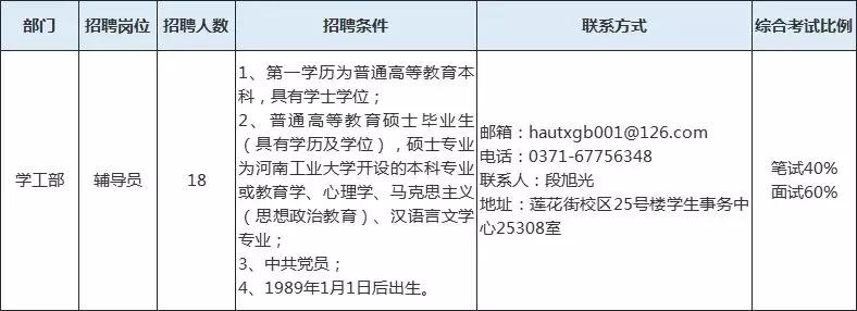 根据我校辅导员队伍建设需要,经学校研究决定面向社会公开招聘非事业编制辅导员岗位硕士人员18名,招聘工作按照《河南工业大学2019年公开招聘辅导员岗位硕士人员工作方案》组织进行。整个公开招聘期间,应聘人员可在学校主页,点击查看本次公开招聘的相关信息。