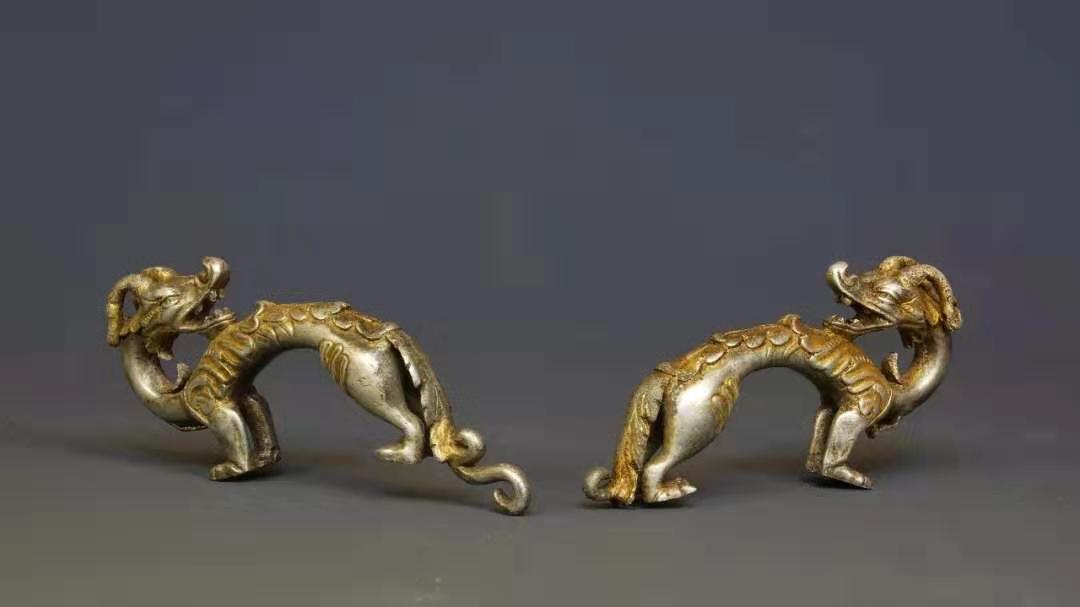 而其中最引人注目的就要数一对鎏金银龙了。“大概8,9厘米长,分别位于外椁棚板上部人骨身下和椁内,造型基本一致。”蓝万里告诉记者。这一对鎏金银龙呈现比较明显的西汉时期特点,根据其弧度分析,应是某种弧腹器物上的耳鋬。“之前蒙古方面也曾在其他匈奴墓葬里发现过雕刻有龙形纹的器物,但是像这种单体龙形式的器物在匈奴贵族墓葬中还是第一次发现。”蓝万里说。