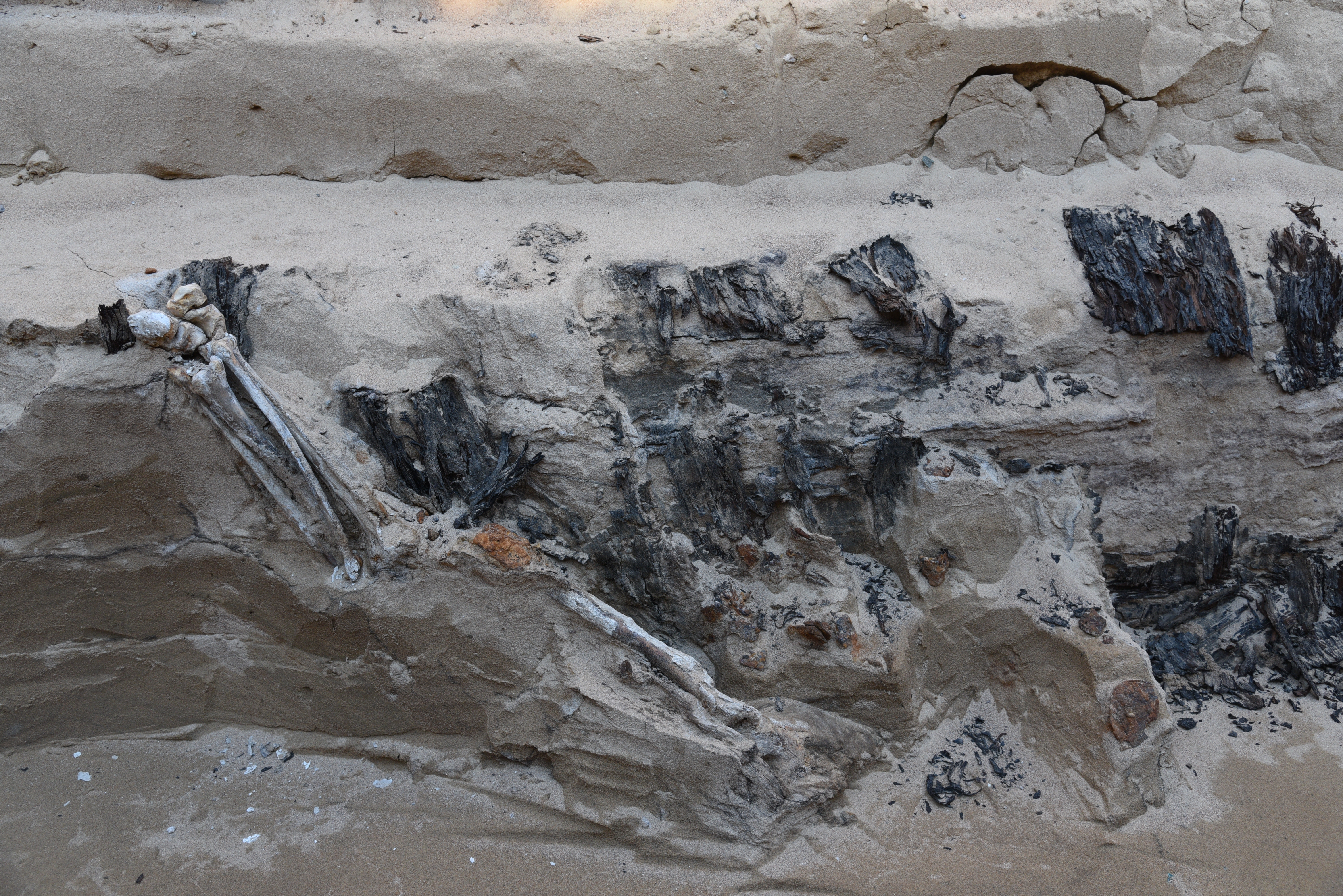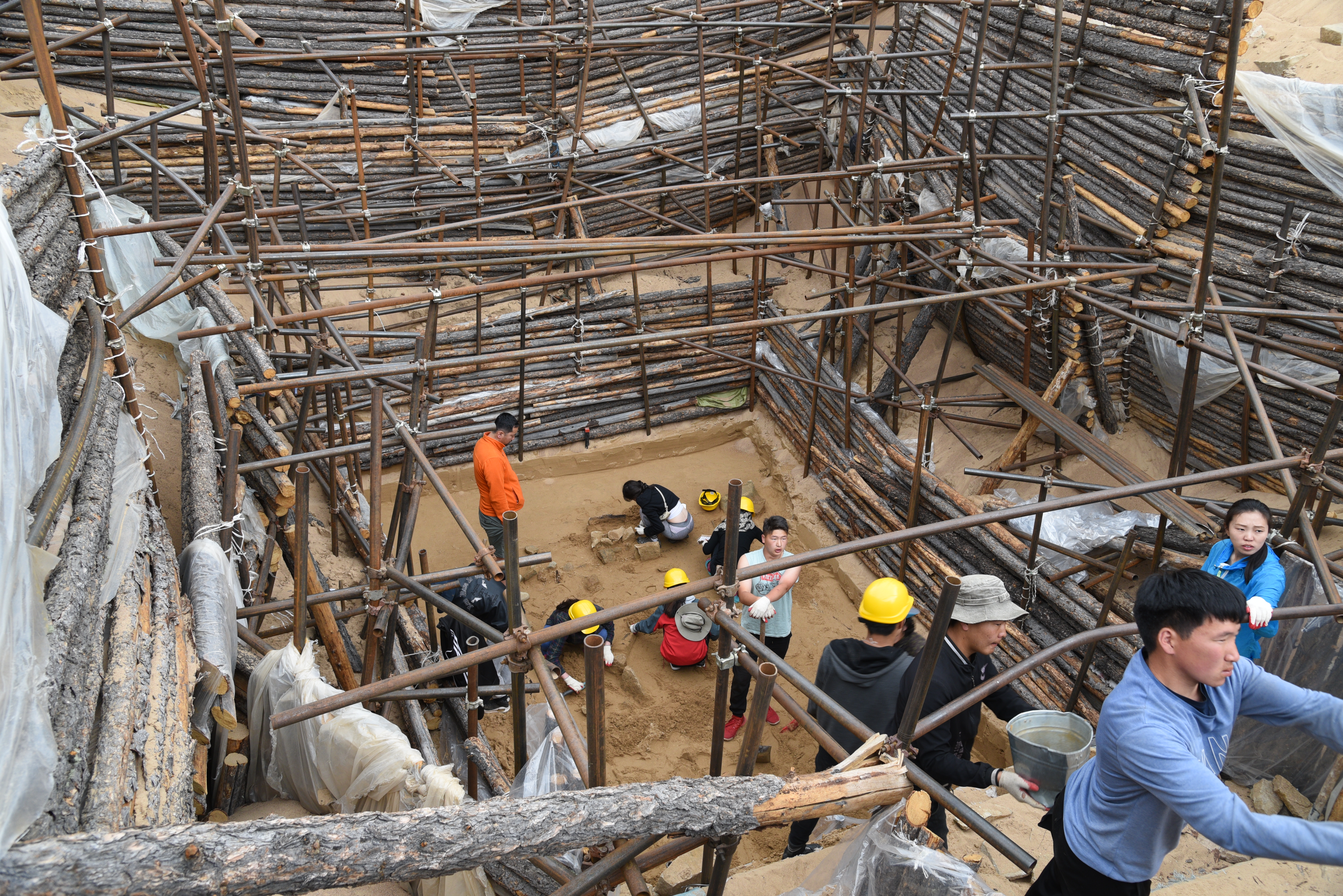 发现这具人骨时,因为椁板的断裂坍塌它已经产生了位移,但不难看出,“他的左手压在胸部,右手正往前探,整个人面部朝下,趴在了棺椁的边缘。”蓝万里告诉记者,这具人骨的上半身和坍塌的椁板已交错在一起,“后来还是通过他的腿部我们才确定,他之前应该是趴在椁板之外的。”