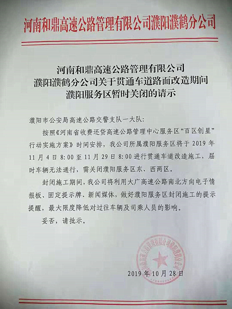 10月31日,记者从有关方面获悉,按照《河南省收费还贷高速公路管理中心服务区“百区创星”行动实施方案》时间安排,河南和鼎高速公路管理有限公司濮阳濮鹤分公司对所属濮阳服务区进行贯通车道路面改造施工,届时车辆无法通行。