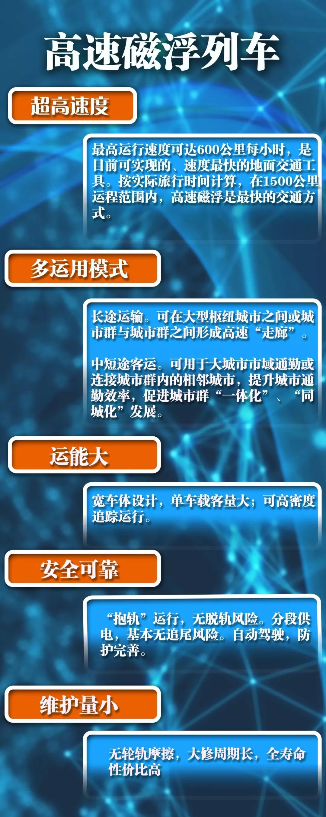 作为一种新兴高速交通模式,高速磁浮具有速度高、安全可靠、噪音低、震动小、载客量大、耐候准点、维护量少等优点。既可用于长途运输,也可用于快捷通勤。
