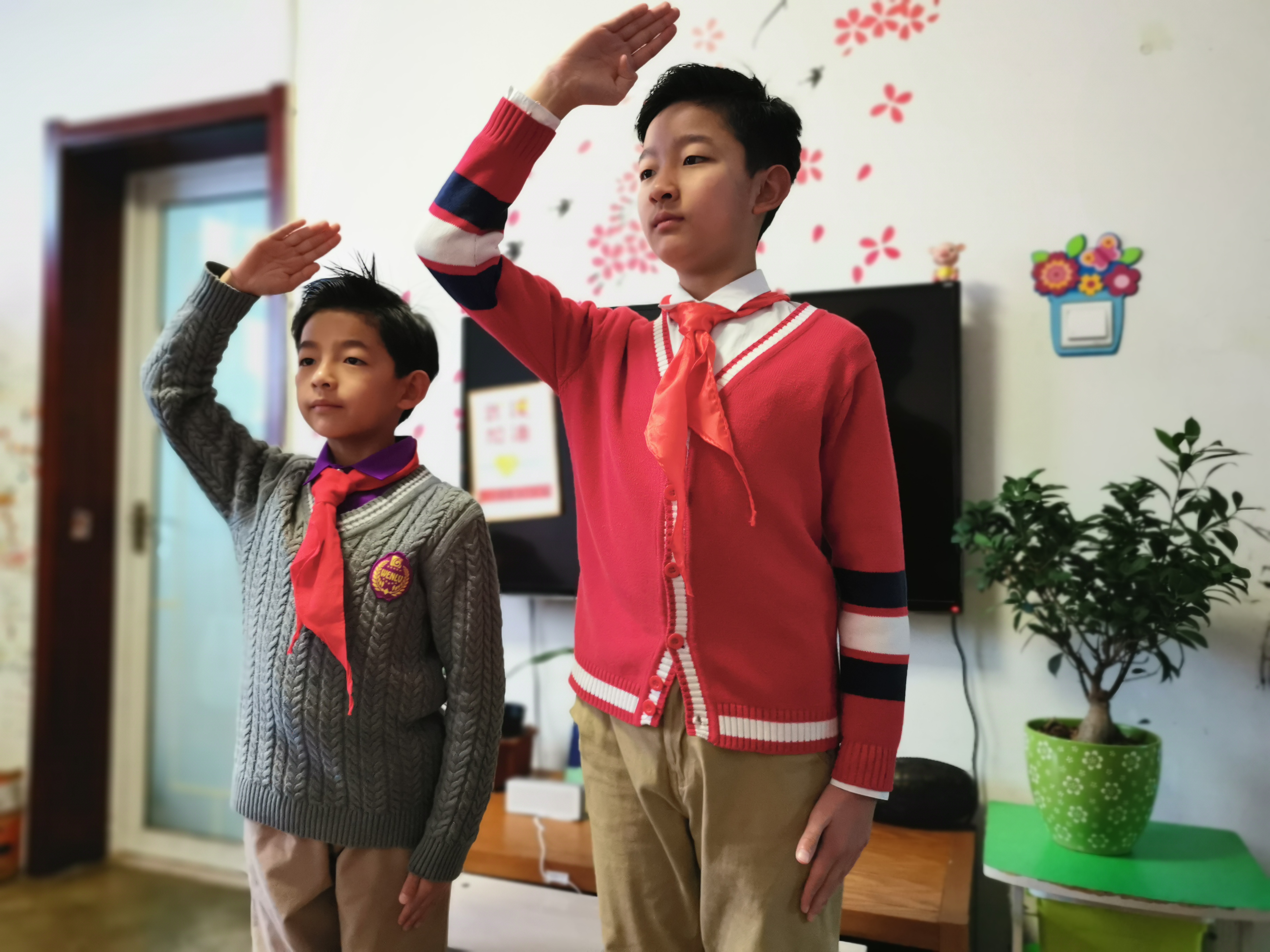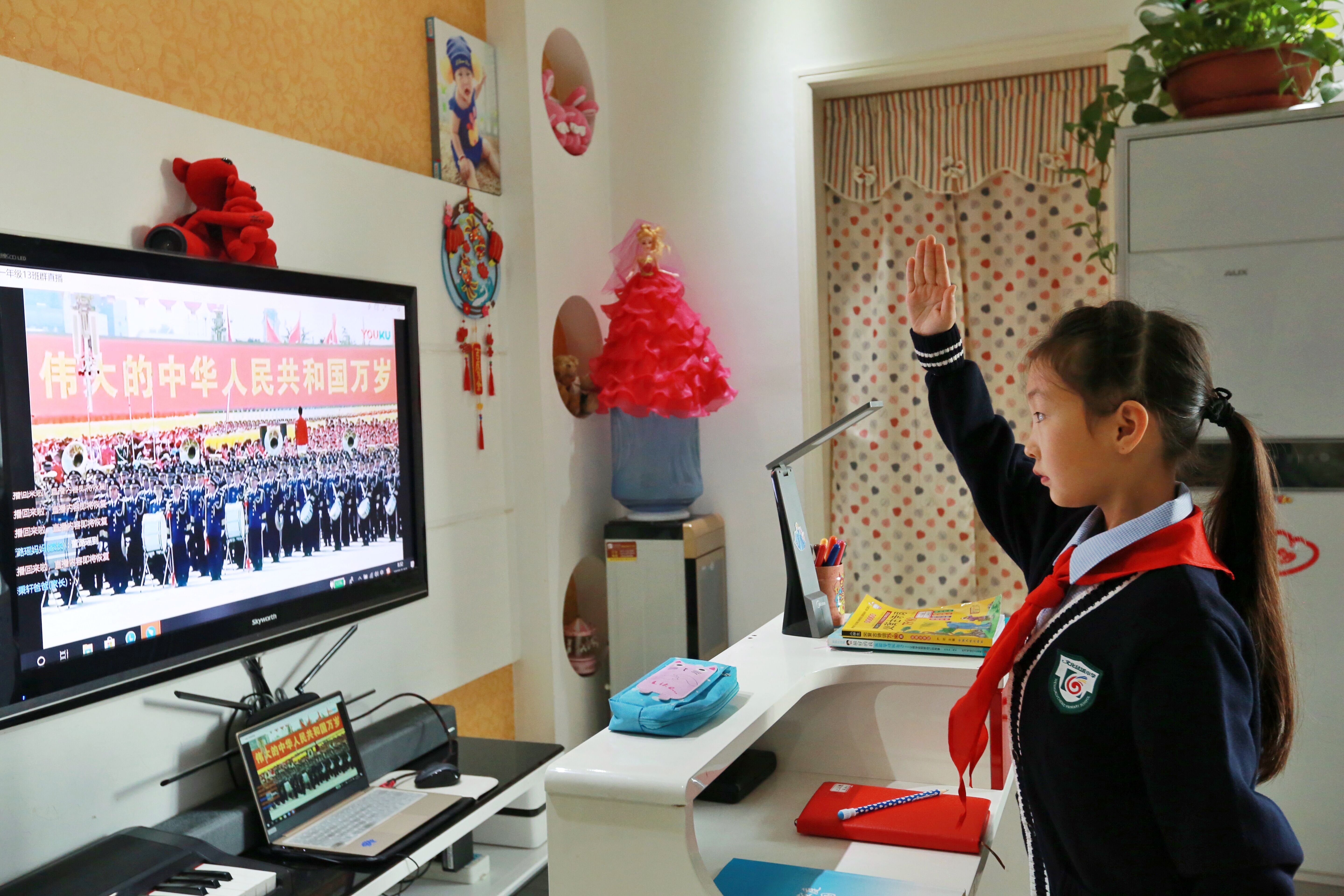 “全体肃立,升国旗,奏唱国歌,行注目礼,少先队员敬队礼”早上8点半,以“心中有英雄 行动做先锋”为开学典礼暨开学第一课如期举行。该校两个校区6592名学生和家长、325名教师以特殊的方式相约网上,开启了特殊而鼓舞人心的网上开学典礼暨开学第一课。嘹亮的国歌声从学子们家中传出,全体少先队员起立面向屏幕上的国旗敬礼,文绿全体师生隔着屏幕都能清晰的感受到彼此的心跳和内心坚韧的信念,在这个庄重严肃的仪式上,坚定信心、凝聚力量,开启了新学期!