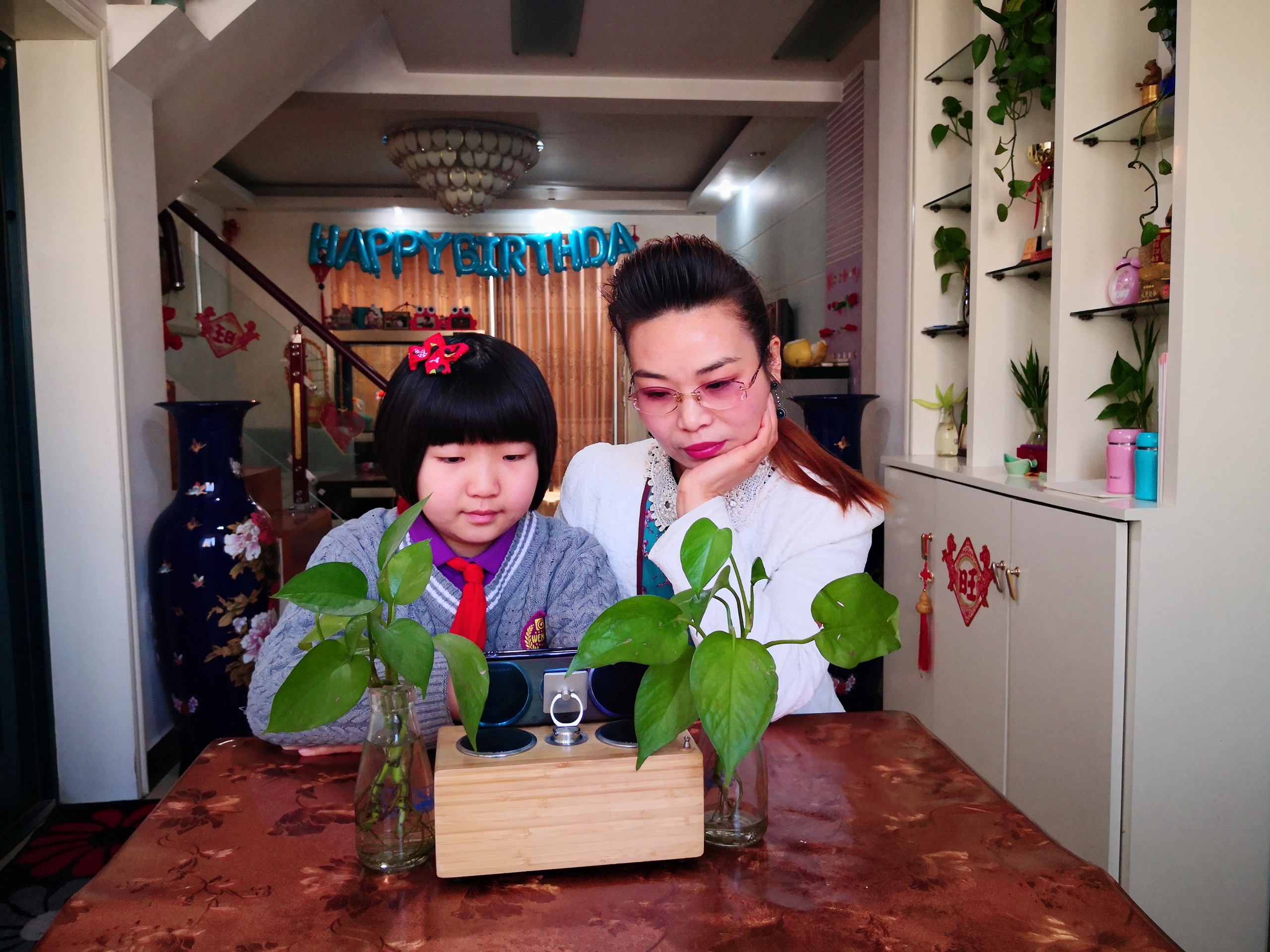 三四班李昕阳和妈妈一起看开学典礼