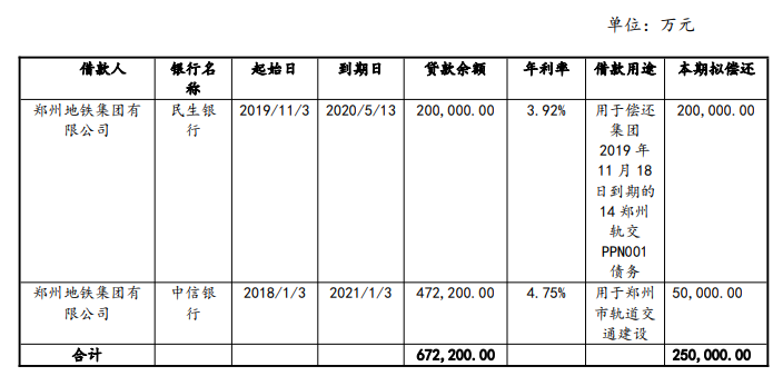 郑州地铁集团有限公司表示,截至2019年9月末,发行人长期借款702.69亿元,一年内到期非流动负债56.82亿元,应付债券33.87亿元,合计793.38亿元。本期超短期融资券发行金额25亿元,将全部用于偿还金融机构借款。
