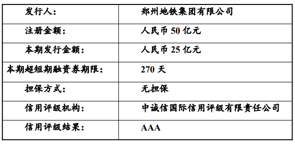 郑州地铁集团拟发行25亿元超短融,偿还银行借款