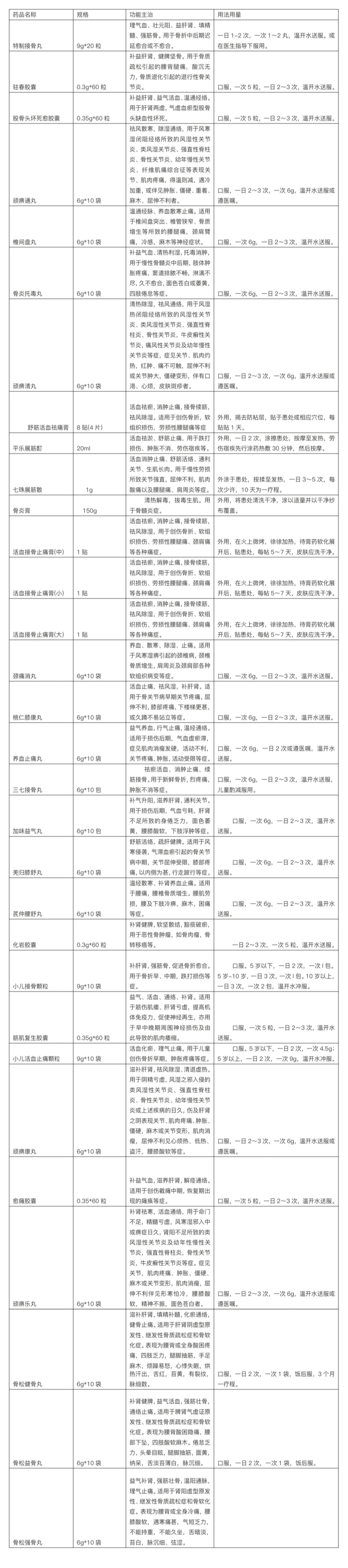 经过几代人两百多年的传承和发扬,目前,以祖传方药、经验方、协定方为主体形成了洛阳正骨系列院内制剂,共计7个常用剂型,养血止痛丸、七珠展筋散、活血接骨止痛膏、舒筋活血祛痛膏、顽痹清丸、股骨头坏死愈胶囊、椎间盘丸、桃仁膝康丸、小儿接骨冲剂、羌归膝舒丸以及黑、白膏药等38种制剂,涵盖颈肩腰腿疼、创伤骨折、骨质增生、骨质疏松、风湿病、骨髓炎、骨关节病、儿童骨折等多种骨病,这些独一份的院内制剂广受赞誉,声名远播。