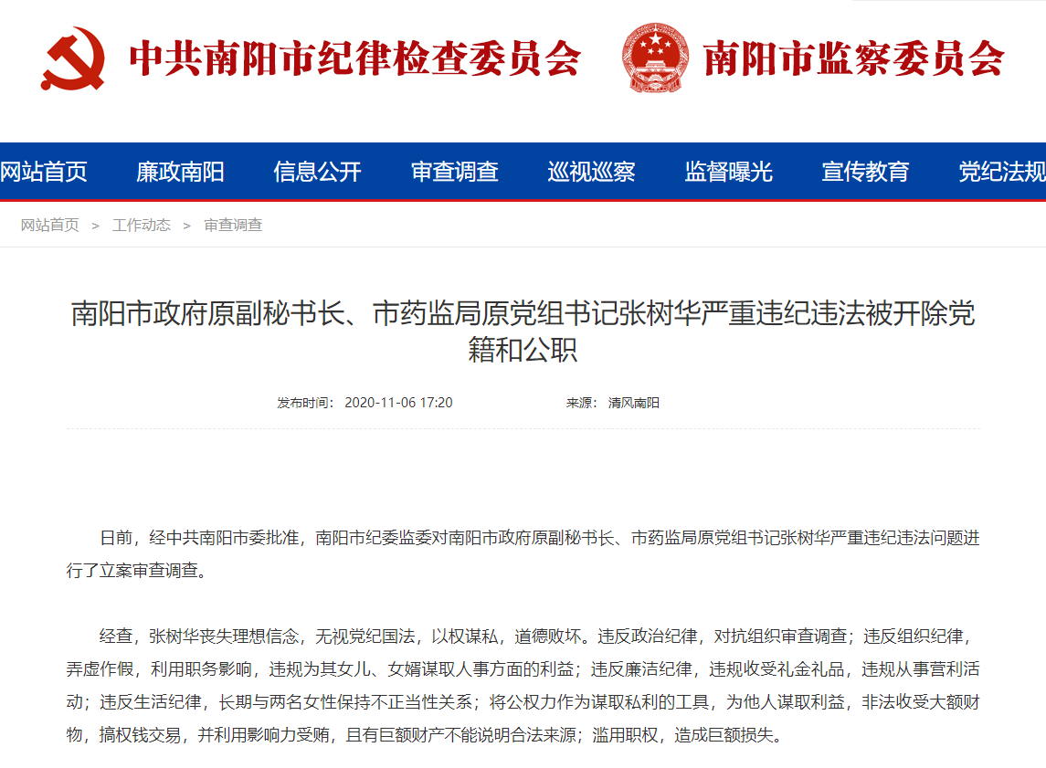 日前,经中共南阳市委批准,南阳市纪委监委对南阳市政府原副秘书长、市药监局原党组书记张树华严重违纪违法问题进行了立案审查调查。