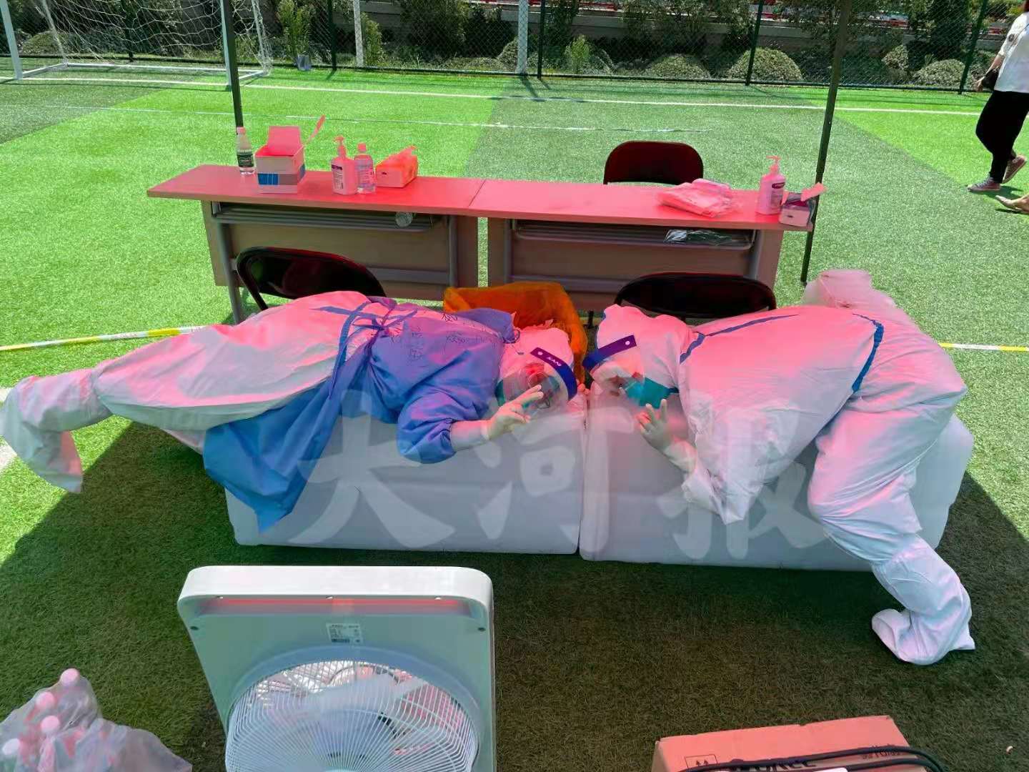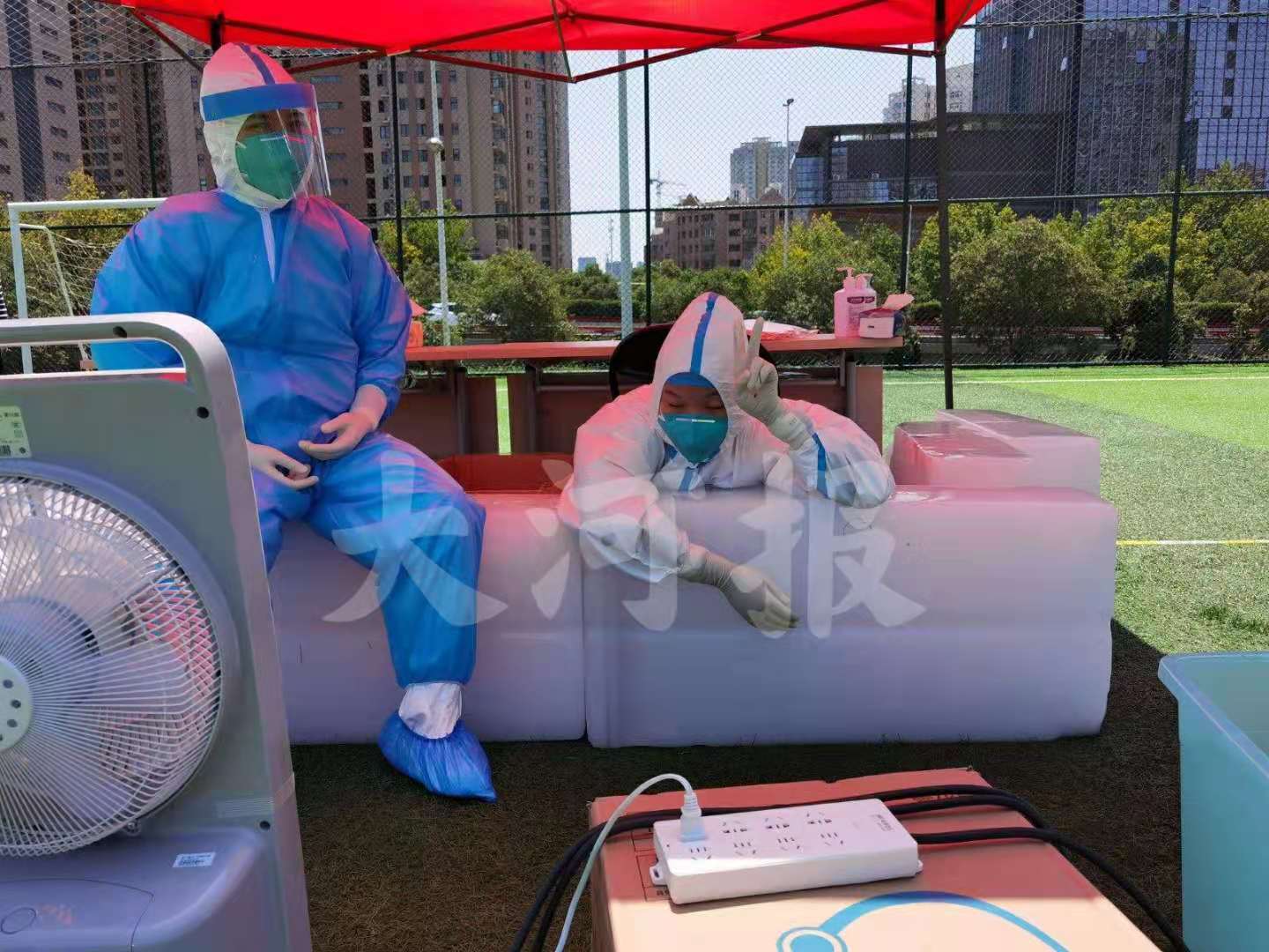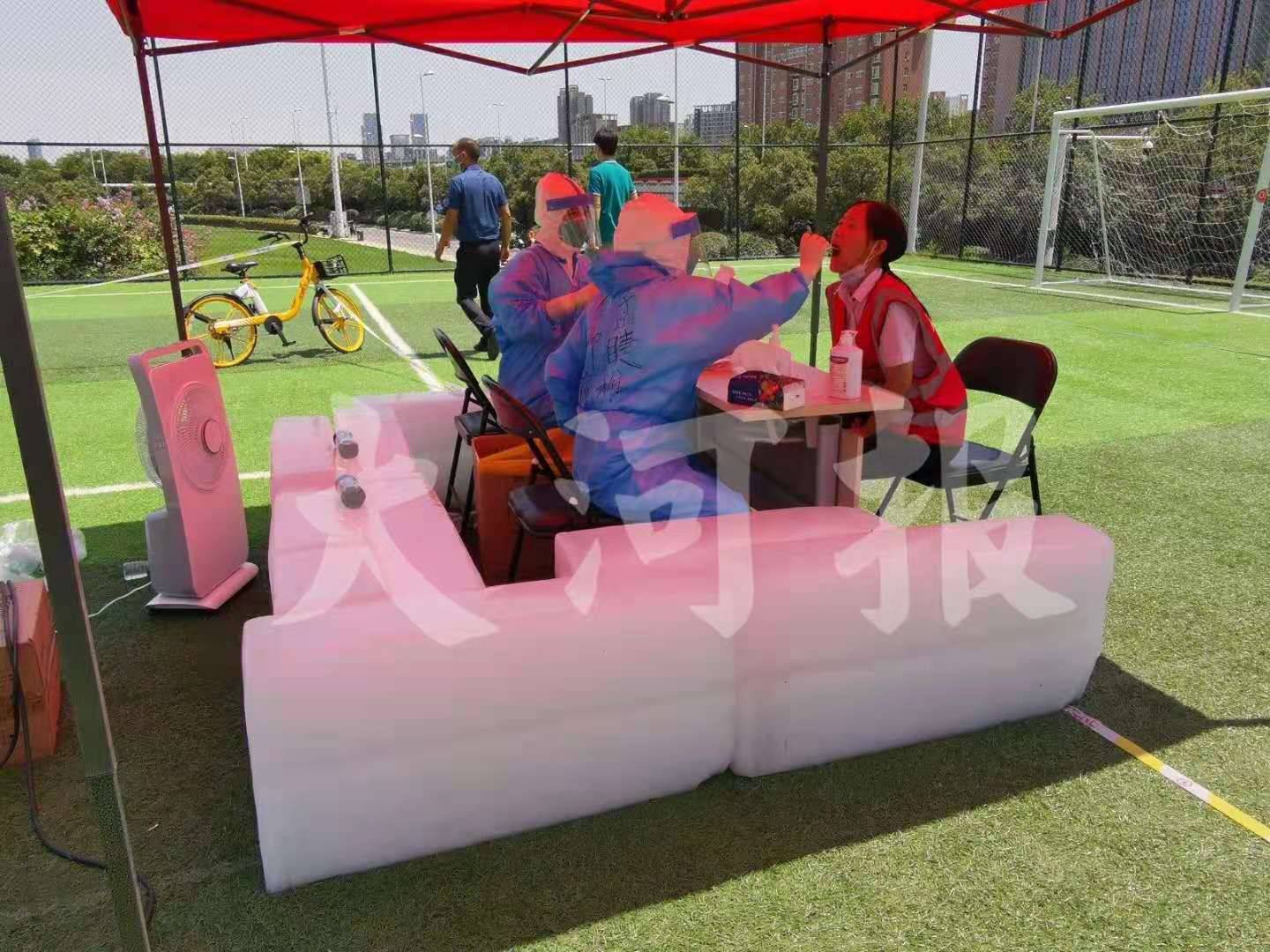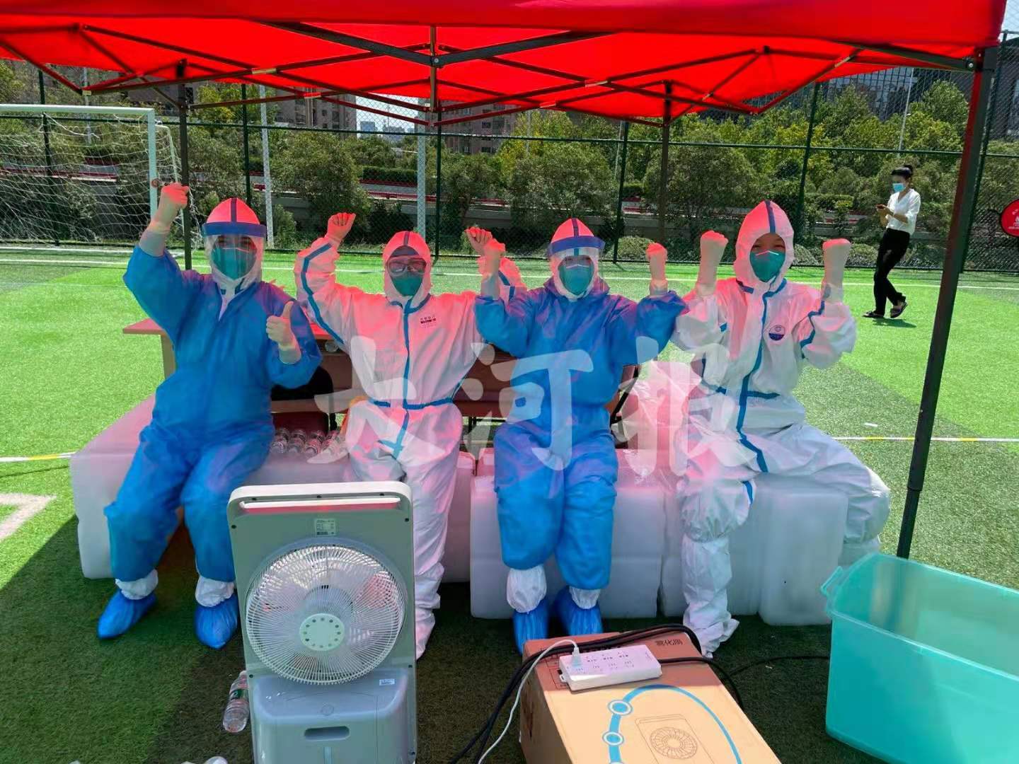 因为天气炎热,工作量大,担心一线的工作人员中暑,省肿瘤医院后勤部不仅给这23个检测点熬制了绿豆汤、购买了西瓜、冰水,同时还购置了15吨冰砖。