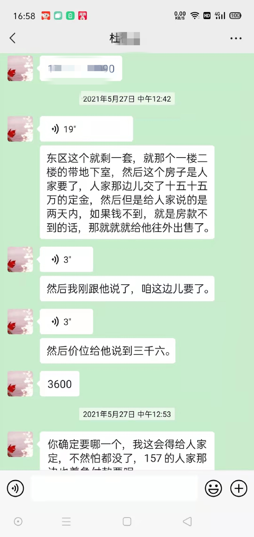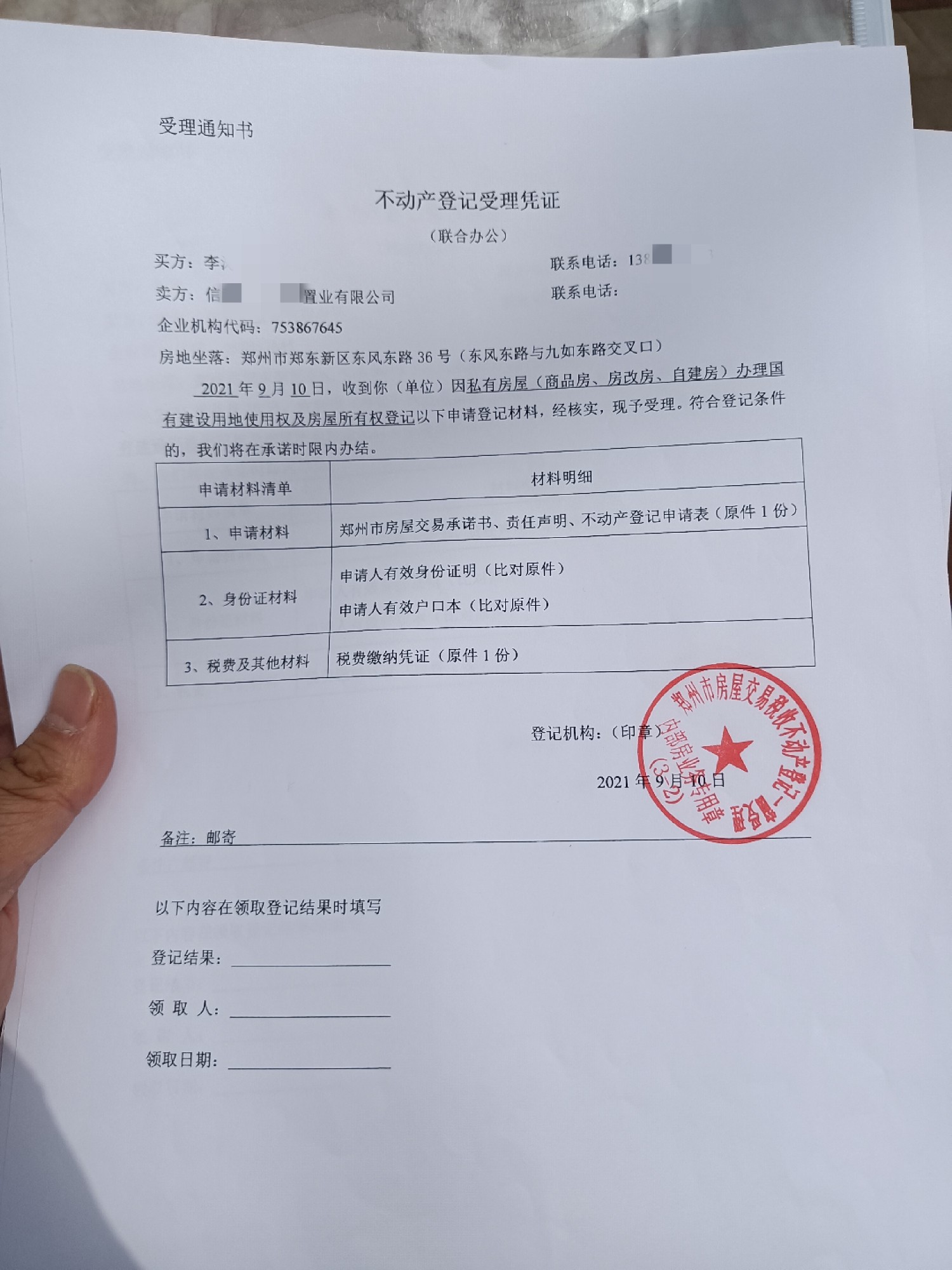 在李先生提供的收据和不动产登记申请等相关材料上,盖有“某开发商”、“郑州市房屋征税领取专用章”、“郑州市房屋交易税收不动产登记—窗受理内部房业务专用章”等印章。杜姓女子与其的微信截图里,也有东区房子3600的字样和内容...