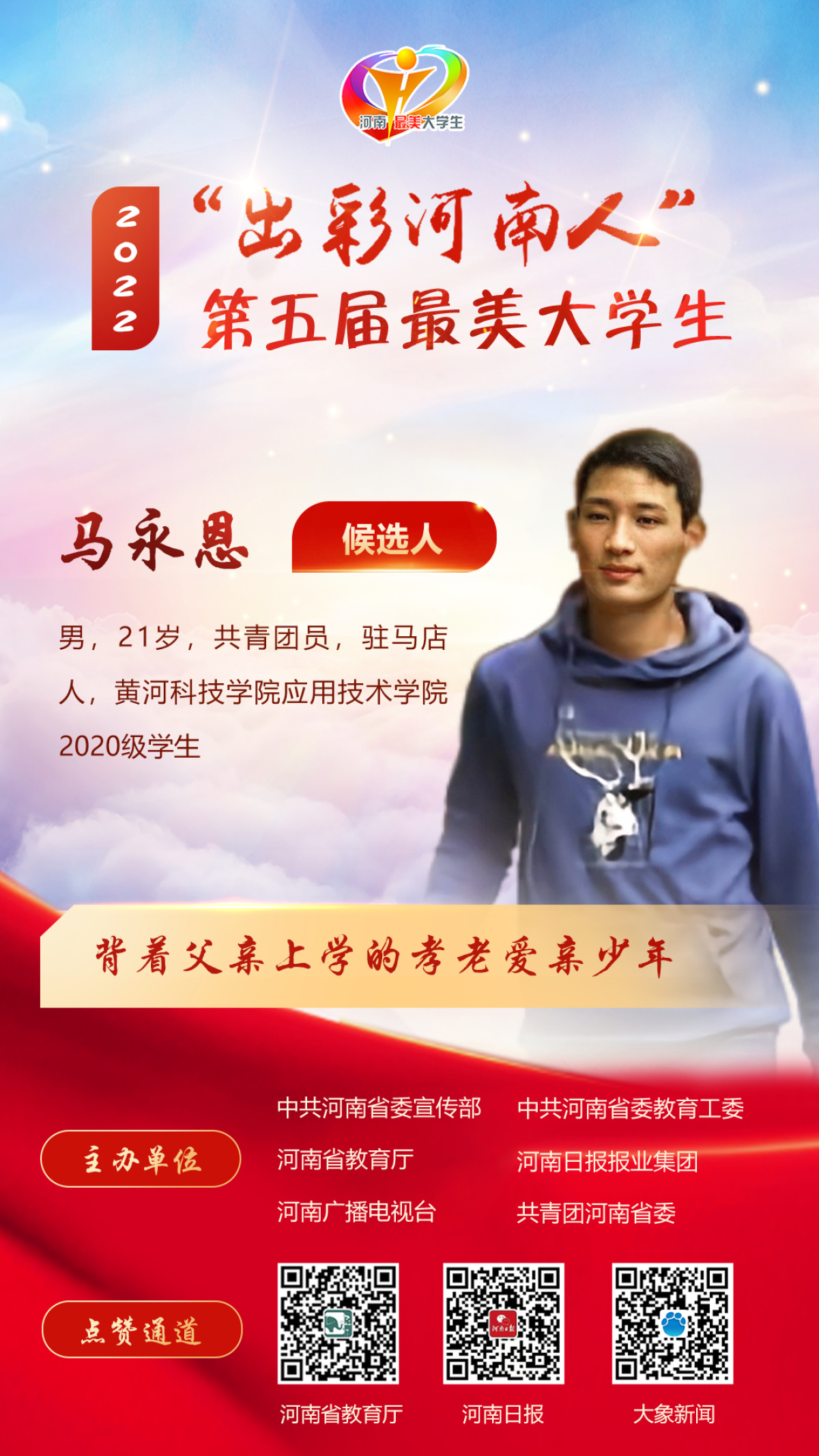 1.马永恩,男,21岁,共青团员,驻马店人,黄河科技学院应用技术学院2020级学生。