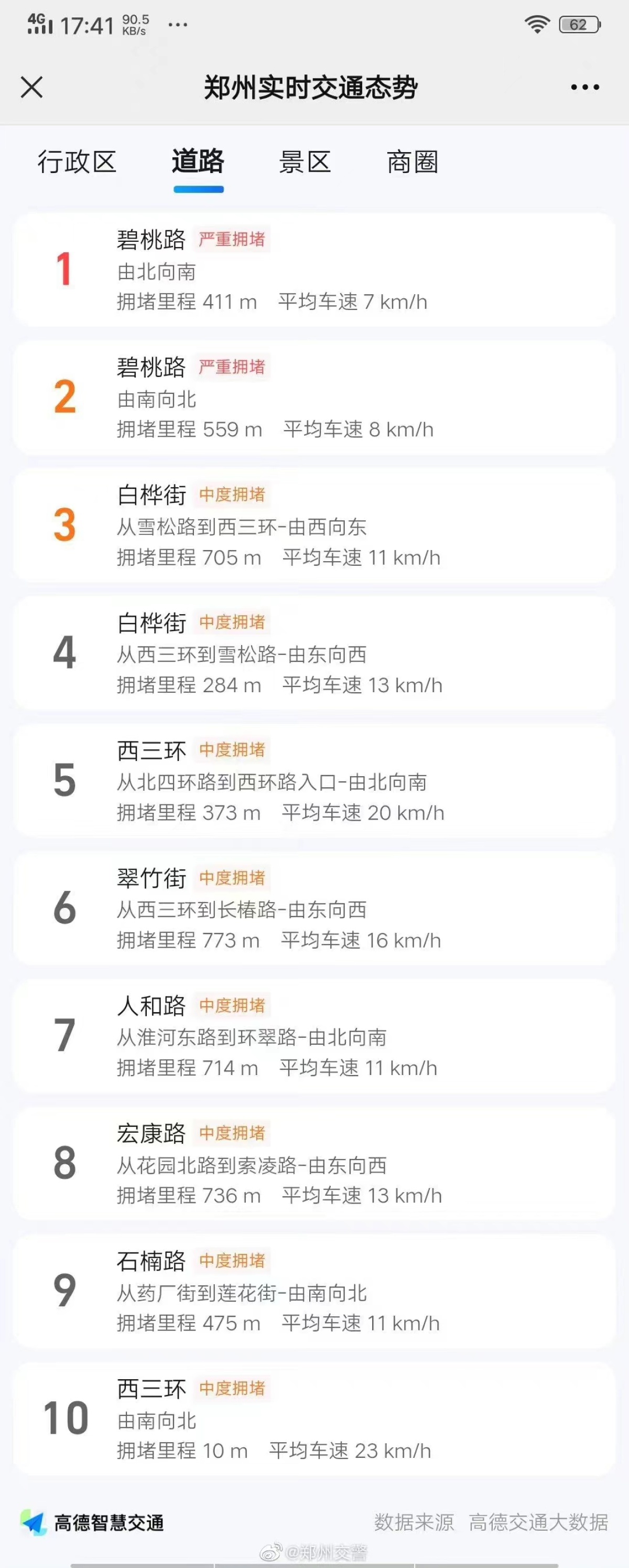 截至7月5日17时41分,郑州市碧桃路南北双向、白桦街(雪松路至西三环东西双向)、西三环(北四环至西环入口北向南)、翠竹街(西三环至长椿路东向西)、人和路(淮河东路至环翠路北向南)较为拥堵。