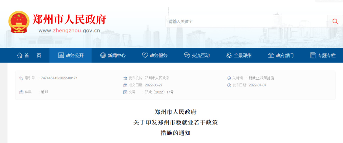 7月7日,郑州市人民政府网站发布《郑州市稳就业若干政策措施的通知》,11条政策措施推动实现更加充分更高质量就业,确保郑州市就业形势稳定,详情如下: