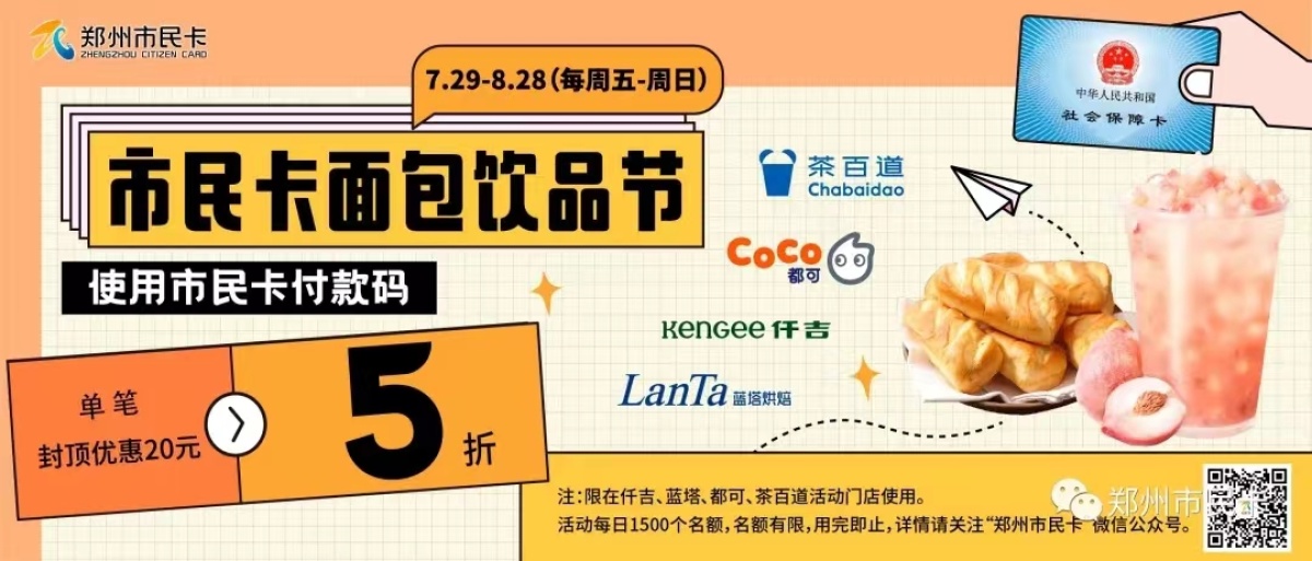活动期间,郑州用户可关注“郑州人社·社保卡”微信公众号,或“郑州市民卡”微信公众号开通“市民卡付款码”,使用市民卡付款码在仟吉、蓝塔、都可、茶百道等四个品牌的200余家郑州门店消费,可享受“5折优惠”,单笔封顶优惠为20元,活动期内同一用户能够享受2次优惠,每个活动日1500个优惠名额,当日活动剩余名额可通过云闪付APP搜索“市民卡面包饮品节”查看。