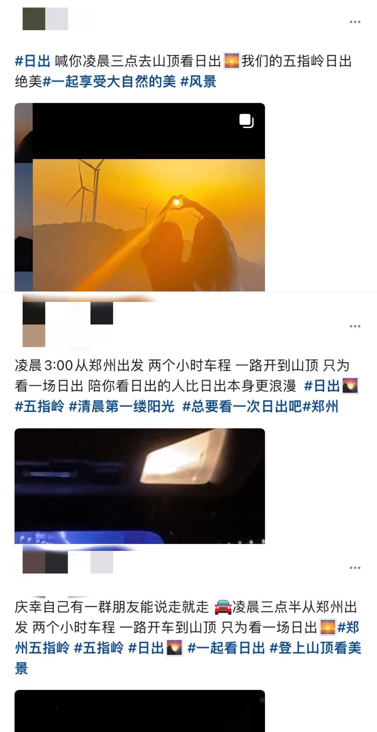 记者在网络平台注意到,除郭先生外,目前已经有不少网友前往五指岭看日出,这里更被网友推崇为郑州周边最适宜看日出的打卡点,在众多网友发布视频中,记者发现,多数网友都选择凌晨三点前往山顶等候日出,周末前往人数较多。