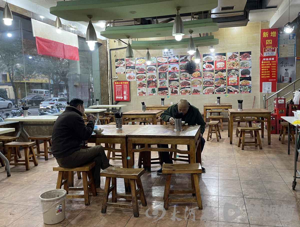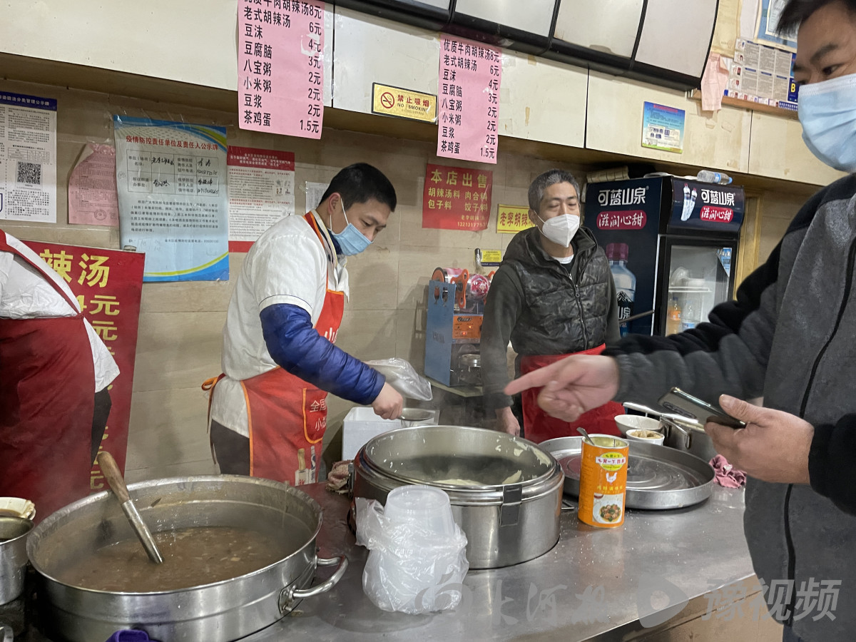 12月2日早上7点半,郑州市东三街上的一家早餐店正在开门营业,刚出锅的煎包、大包子、热气腾腾的胡辣汤、现炸的油馍头和肉盒儿……品种多样,来买早餐的市民在门后扫码后陆续进入,有的打包带走,有的坐在店内堂食。听到坐在店内边吃边聊天的顾客说:“两个月了,第一回堂食,早馋了!”