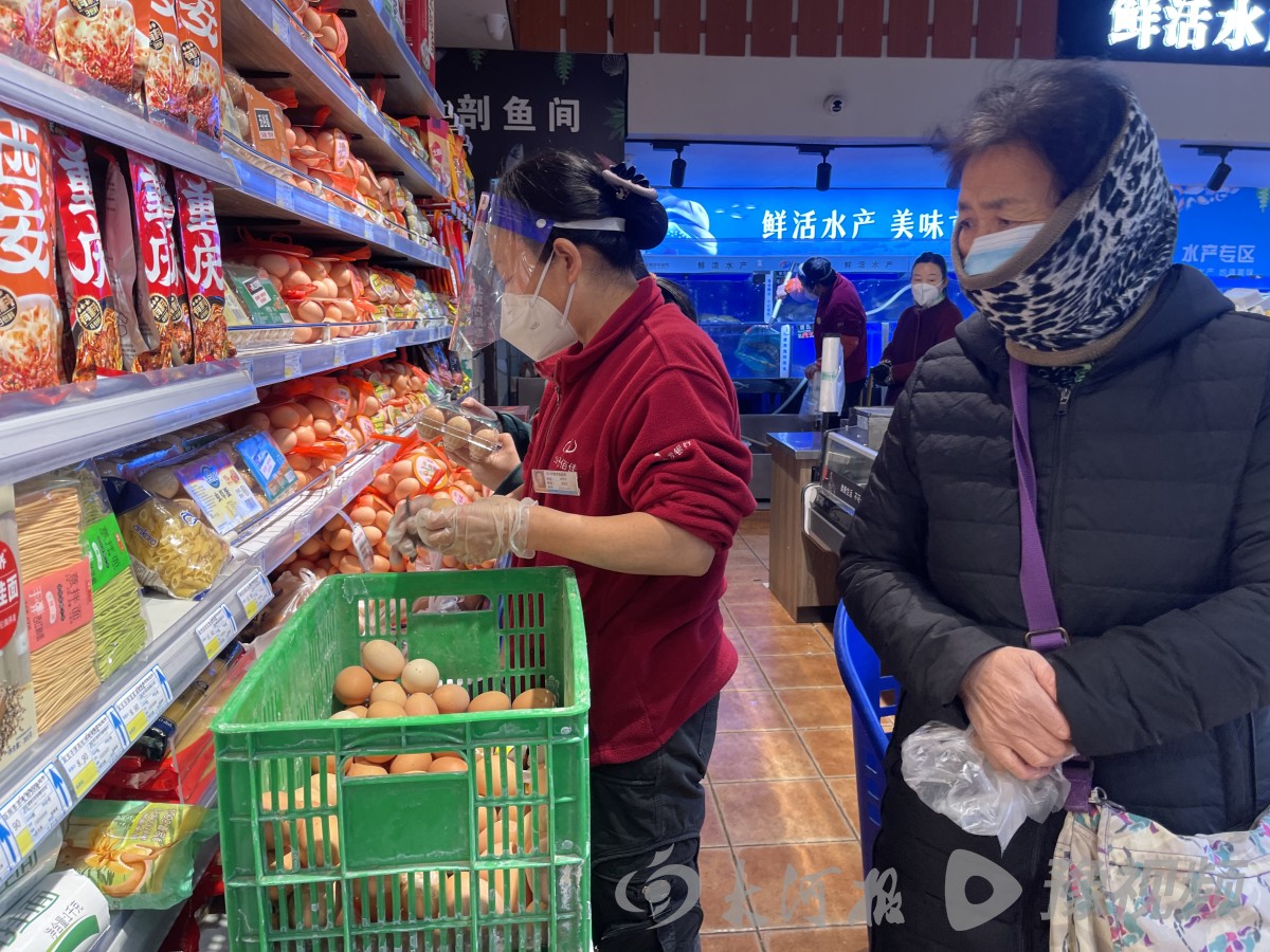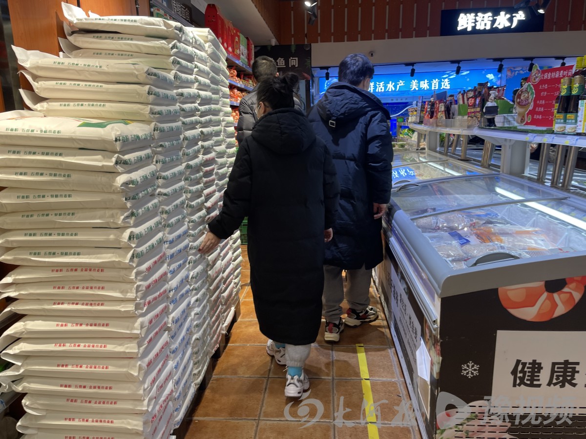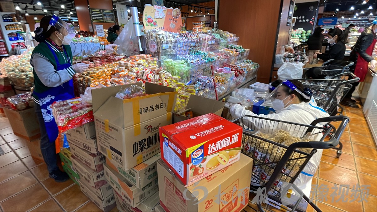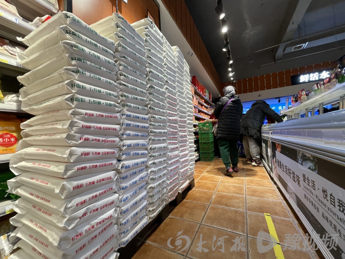郑州的不少超市货源充足,这家超市里的面粉堆得跟小山似的,店员们都在忙着上货。