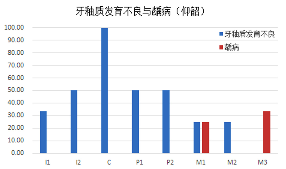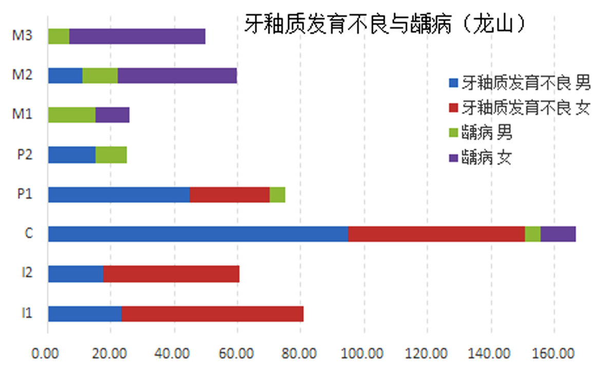 仰韶男性龋病患齿率为6.67%,与原始农业5%左右的龋病患齿率较接近,而龙山男性患齿率略高于仰韶男性,龙山女性更高,达到12.5%,已经高出了较发达农业社会的平均值(9.2%)。或许在龙山时期,仰韶村遗址已经处于较发达农业经济中。