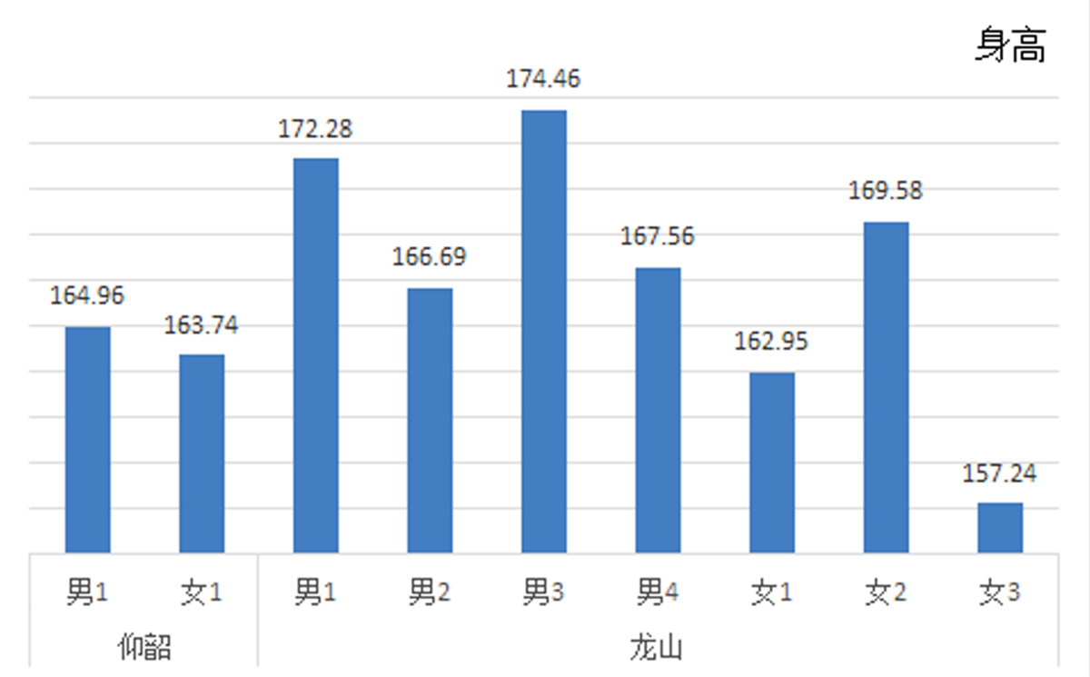 他们对仰韶2例、龙山7例成年个体推算了身高,发现身高普遍较高。龙山男性均高于仰韶男性,龙山女性的最高身高也超过了仰韶女性。龙山时代男性的多处创伤说明生前存在暴力撞击和暴力打斗等行为。